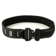 The GBRS Group Assaulter Belt utilizes a 2 belt system to create a lightweight, flexible yet rigid and stable platform to attach equipment, holsters, and accessories. This is done by using Type 13, 1-23/32" belt webbing (7000 lbs. tensile strength) as the base, with a field of PALS webbing, laser cut from a semi-rigid woven thermo-polymer. This ensures that your equipment is always secured to something rigid while allowing the belt to remain lightweight and comfortable. To round it off, GBRS double ,W, stitches the webbing to a load rated, 1.75" Austrialpin Cobra buckle with a D-ring for attaching helo lanyards and other equipment. The outer belt has an inner facing of ,loop, style Velcro, to attach to a low profile ,hook, inner belt. This is done because hooks should never be worn towards the body, especially in such a high-wear area (belt line). The inner belt system consists of a low profile ,hook, inner belt with a single layer of 1.5" scuba webbing. This results in a system that doubles as a non-metallic EDC belt and is a comfortable and convenient way to cover the abrasive hook portion of the inner belt when flipped inside out. The single layer of scuba webbing allows for a rigid surface for IWB holsters to secure firmly.