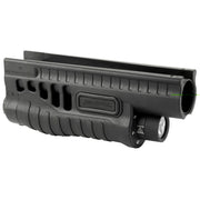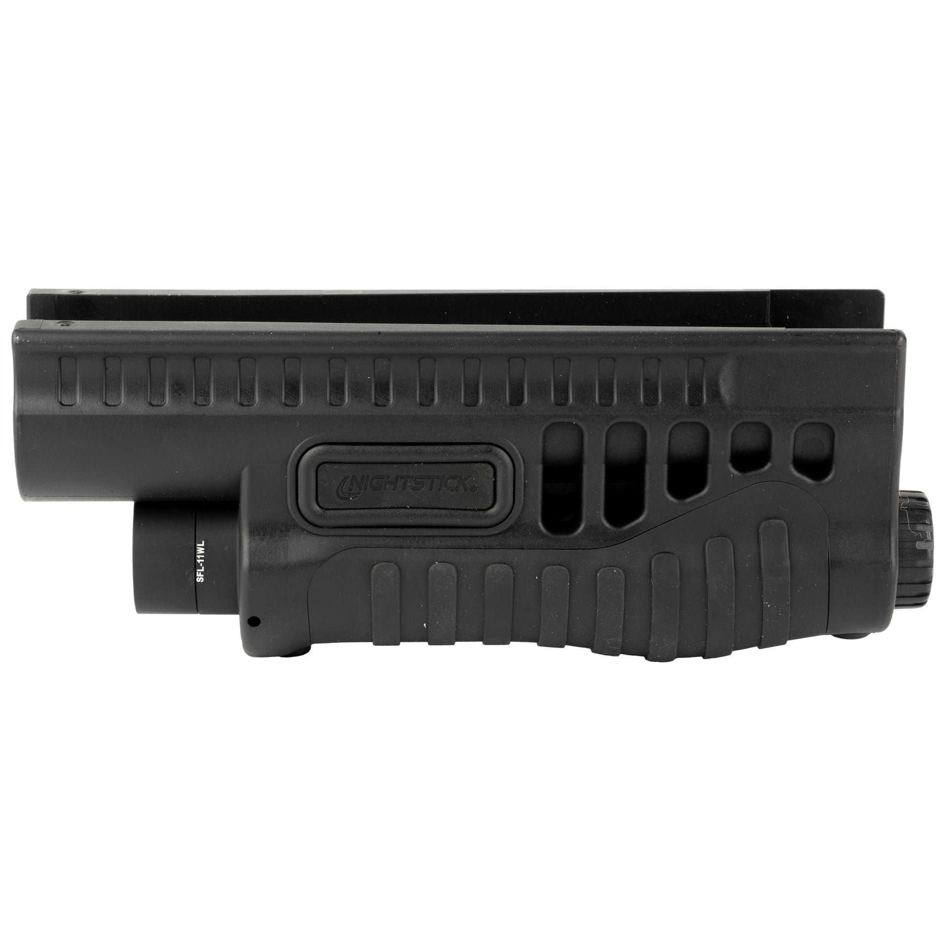 The SFL-11WL shotgun forend weapon light is a complete forend replacement for your 12 gauge Mossberg 500/590/590A1 or Shockwave pump-action shotgun. Built from a one-piece body of heavy-duty glass-filled nylon with an over-molded rubber grip area, it features a super-bright LED rated at 1200 lumens with an hour and a half runtime. Designed around a high-efficiency deep parabolic reflector, the tightly focused beam has a 203-meter beam distance