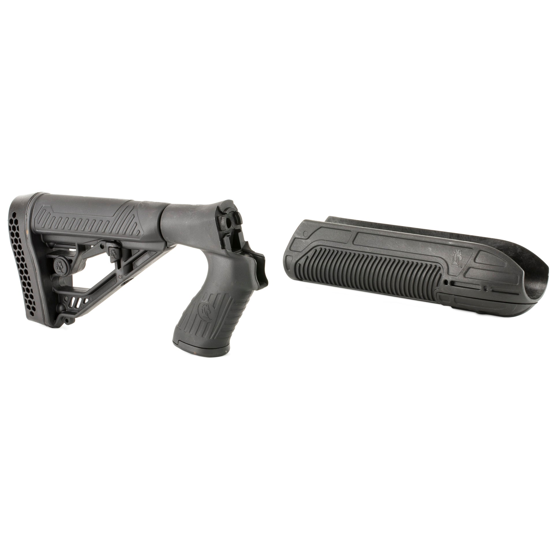 The Adaptive Tactical Forend and M4-Style Stock for Mossberg Shotguns is optimized for pump shotguns. The advanced design features and high-impact polymer construction of the EX Performance Adjustable Stock and Forend make it an ideal choice when upgrading your Mossberg 500 and 590 series 12 gauge pump shotgun.The EX Performance Forend features a 2 inch picatinny rail concealed under the nose cap. Uncovered its ideal for attaching tactical accessories like lasers or lights. The EX Performance M4-style Stock with pistol grip features an easy-to-reach rapid adjust lever for custom length-of-pull, and includes an integrated QD swivel attachment and molded in non-rust standard sling swivel attachment. Durable polymer construction with non-slip vented rubber recoil pad, oversized extra strength adjustment pin and sleek industrial design.