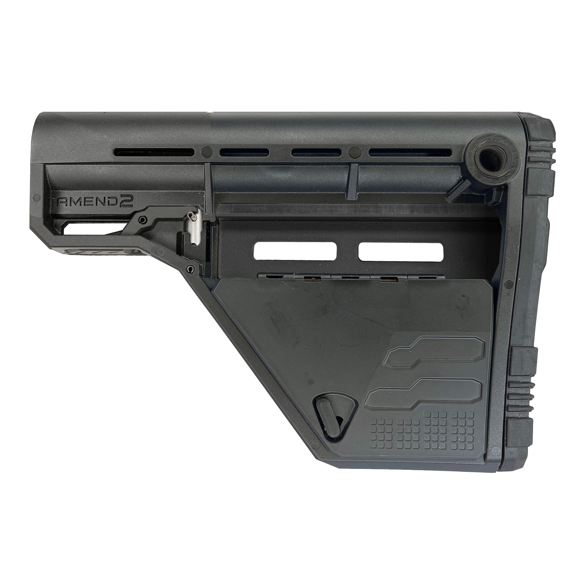 One stock. Unlimited options. The Amend2 Modular Stock (AMS) provides users with a one stop shop for mission configurable stock accessories. Whether you need battery storage, a small compartment for your field notes, on-board cleaning kit, or an ultra light minimalist stock, the AMS can be configured to fit your mission requirements.