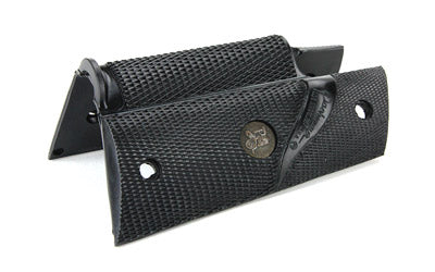 Pachmayr Signature grips feature a wraparound design and are made from rubber specially formulated for use on semi-automatic handguns. They are supplied without backstraps to be used on handguns like the 1911 model that utilizes a grip safety mechanism. Screws not included.