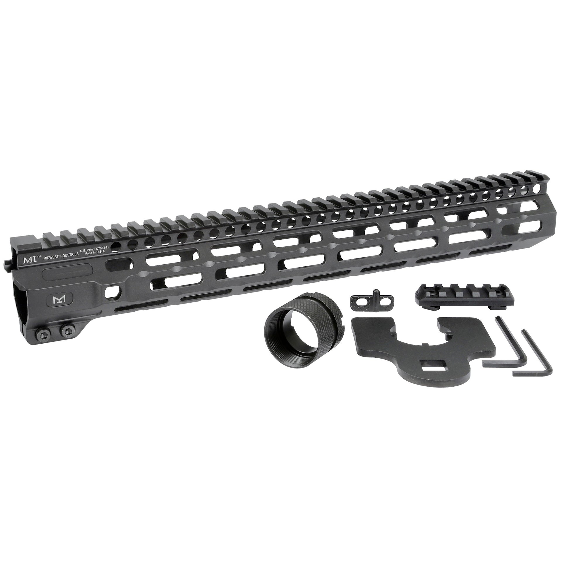 - ,14, SELLCOPY;MWMI-CRM15;,The Midwest Industries Combat Rail Series Handguard is a 1-piece design that features M-LOK accessory mounting slots on 7 flats along its length, a full length Picatinny rail at the 12 oclock position and two QD sling swivel mounting points. This robust design has a slim profile and is machined from rugged 6061 aluminum with a type 3 hard coat anodized finish. Comes with mounting hardware, barrel nut wrench and a 5-slot polymer M-LOK accessory rail. Midwest Industries is a proven leader in the firearm industry. Made in the USA, focusing on the small details to make your rifle platform better.,