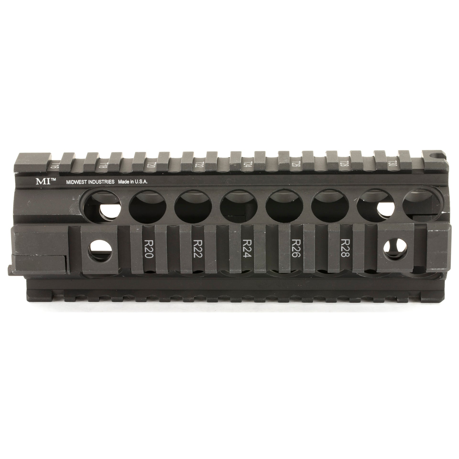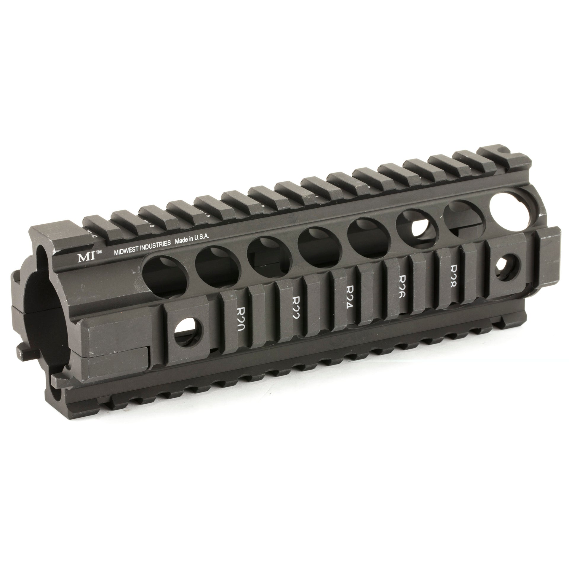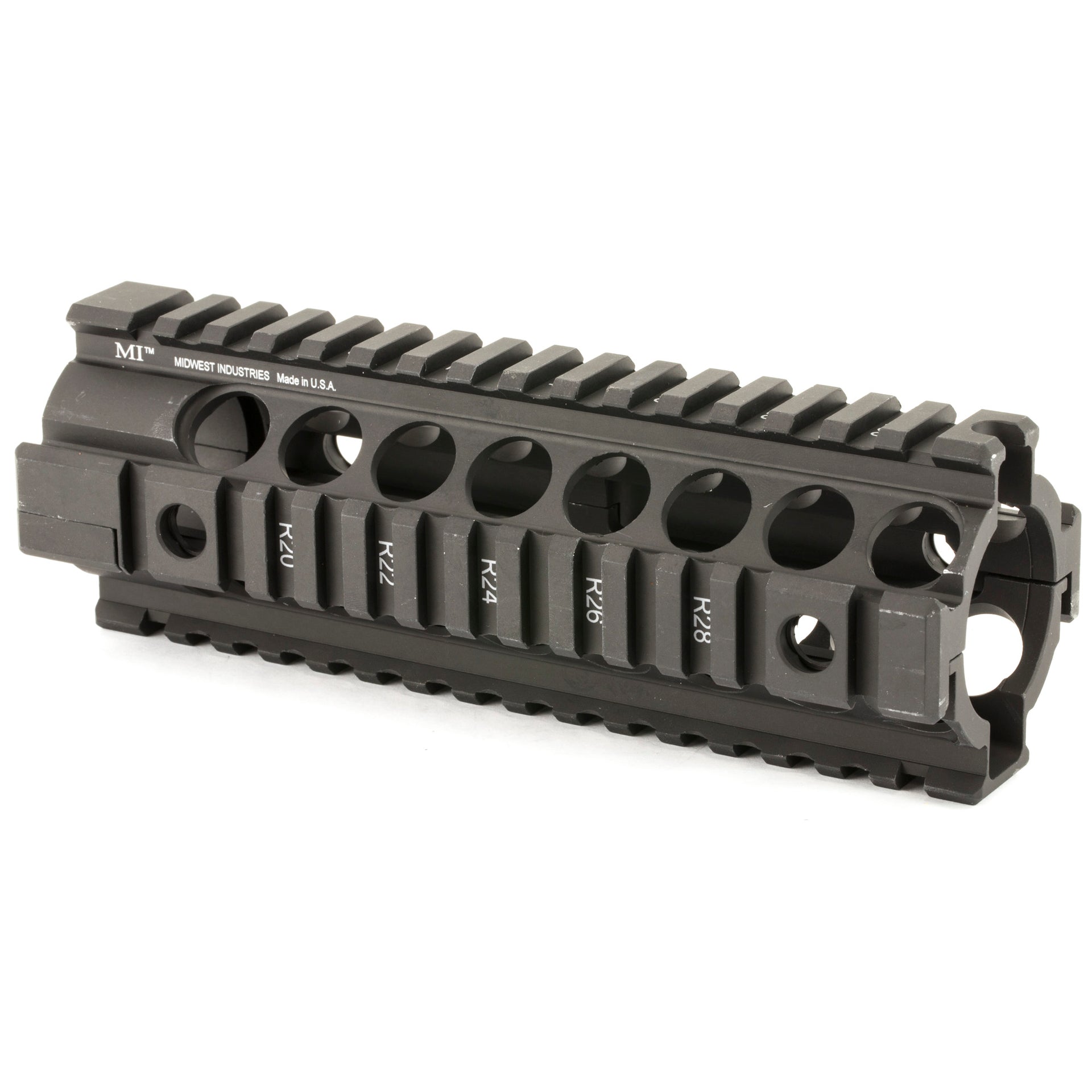 The Midwest Industries Carbine Length Gen 2 Two Piece Free-Float Handguard installs easily in minutes. The addition of this two-piece free float handguard to your rifle platform gives you the free float performance you want in a handguard, while creating more space for you to mount accessories. There are four anti-rotation QD sockets for push button sling swivels and four high quality 1913 mil-spec rails. It is incredibly lightweight and works with most well-known piston systems. Midwest Industries is a proven leader in the firearm industry. Made in the USA, focusing on the small details to make your rifle platform better. Removal of the delta ring is required.