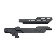Heatseeker is an innovative, affordable chassis system for your bolt action rifle, allowing you to easily upgrade a traditional factory rifle stock for improved versatility and a sleek, modern appearance. This 1lb, 1 ounce chassis is machined from billet (solid block) high-strength 6061-T6 aluminum and includes a 6 ounce, 9" handguard cut from a unique extrusion shape exclusive to Sharps Bros. Both the chassis body and the handguard are finished in a matte black Cerakote. The handguard features MLOK slots on 4 sides for various attachment options (light, bipod, night vision, ARCA rail...) and two quick disconnect fittings per side for sling attachment.