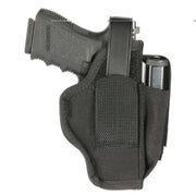 This versatile, fully ambidextrous holster gives you the option of belt-mounted or inside-the-pants configurations. Fits belts up to 1.75" wide in a traditional vertical position and fits belts up to 1.5" wide in horizontal position (middle of the back). Includes a spare magazine pouch with adjustable retention flap.