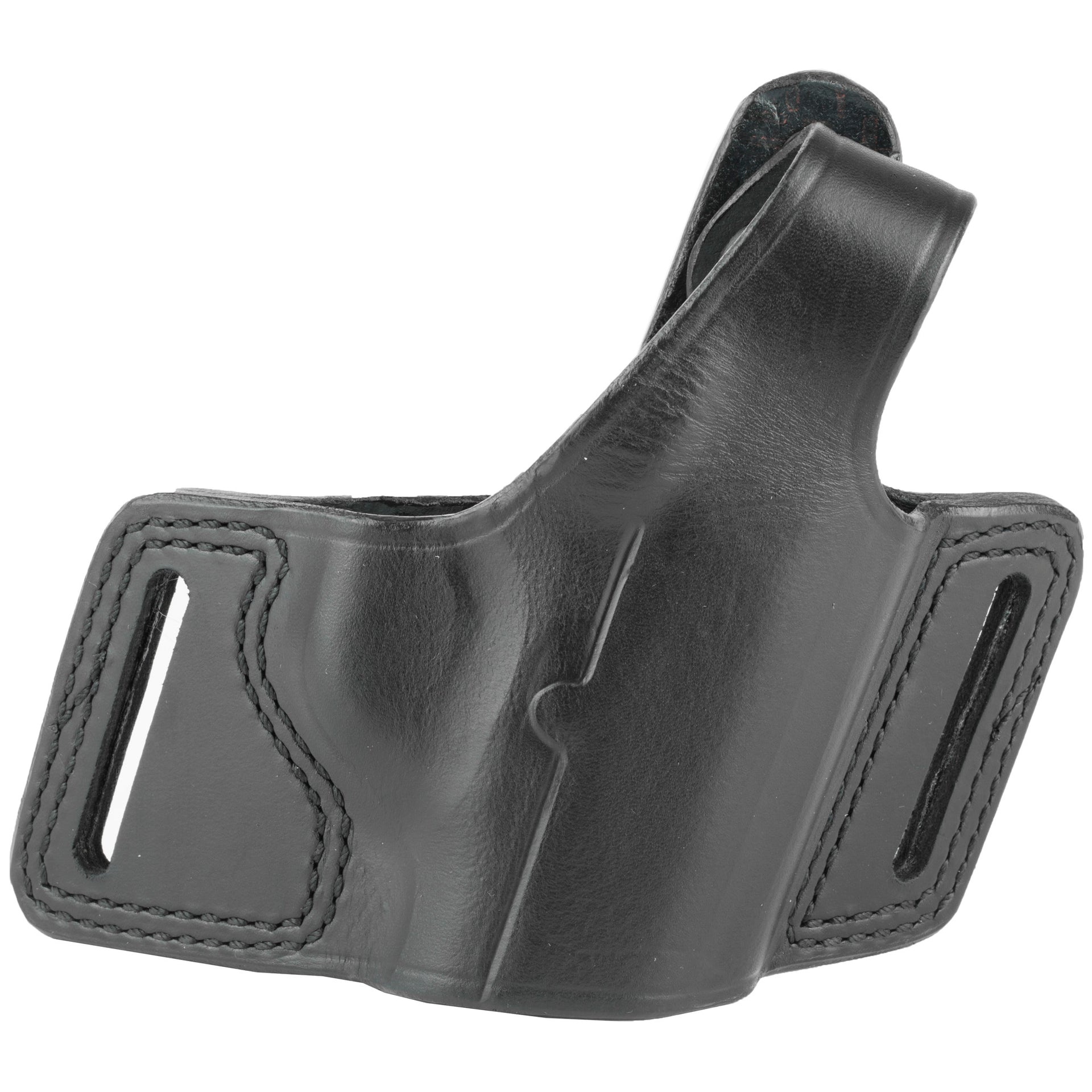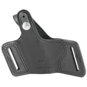 The Black Widow belt slide holster is an ultra hi-ride carry with a thumb snap closure. Dual belt slots provide stability and the open muzzle design offers fits for same pistol models with differing barrel lengths. Compact profile and widely spaced belt slots allow the pistol to ride close to the body for both comfort and concealability.