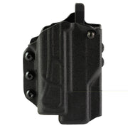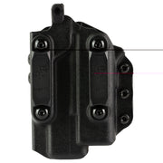 A self-locking OWB plain clothes level II Kydex concealment holster with a host of optional adjuncts. Its intuitive thumb release is well concealed and extremely effective in securing the weapon in place and out of the eyes of a potential adversary. The Quanticos 1 3/4" belt loops can be adjusted slightly for height and cant. The patent pending ejection port lock has been strength tested and has exceeded all standards. The Quantico Undercover will self-secure with or without the weapons light attached.
