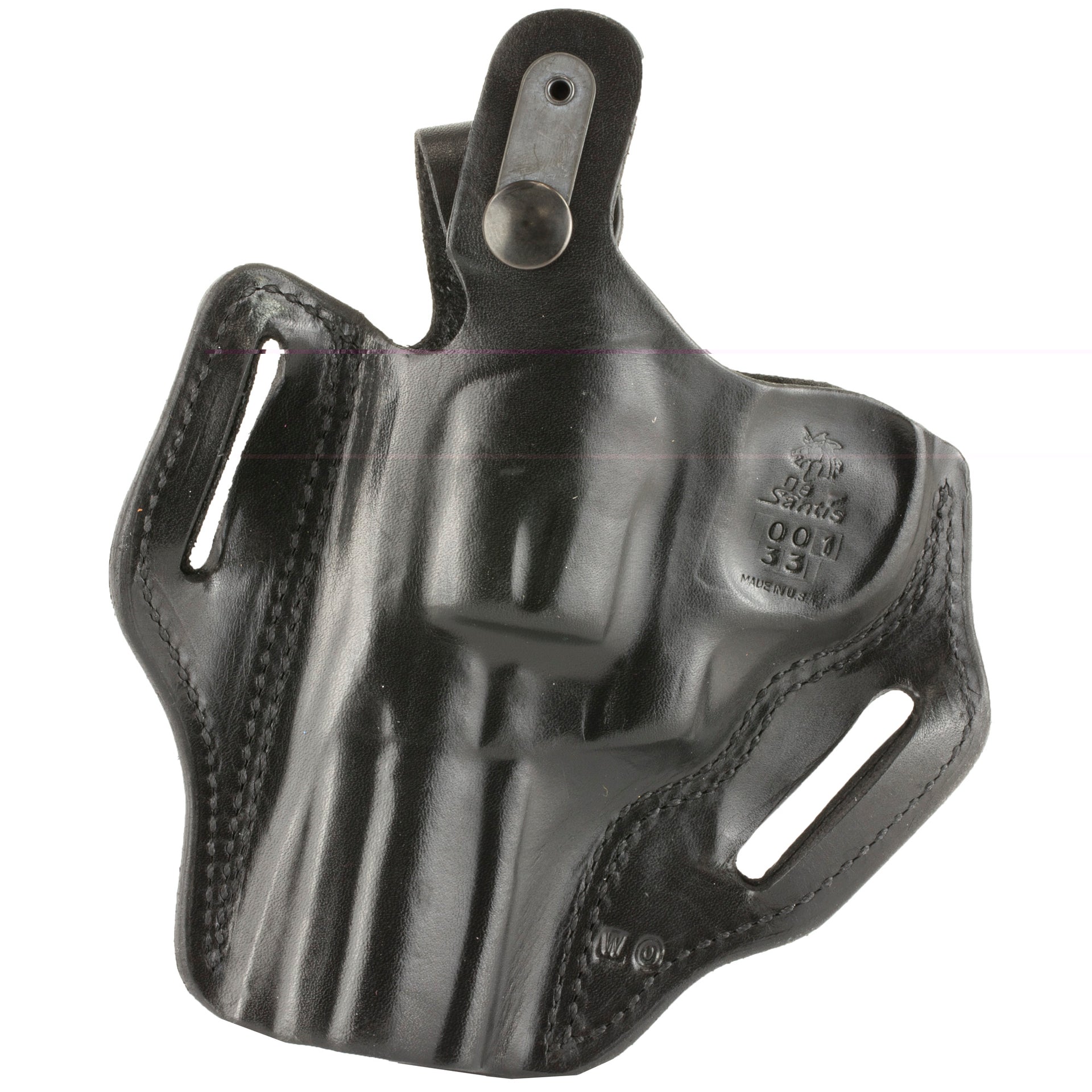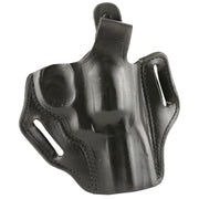 The firearm rides high and is presented at an optimum draw angle. Its thumb break and exact molding, together with a tension device, allows for a secure and highly concealable carry. Belt slots are 1 3/4" wide. Some models with two belt slots and without tension device.