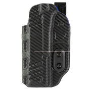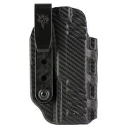 The Slim-Tuk Carbon Fiber is a minimal ambidextrous IWB holster fashioned from Kydex sheet. One of the most unique features about this IWB holster is that it uses DeSantis tuck-able 360 C-Clip, which affords the wearer unlimited mounting options. The hardware can easily be reversed to change from right to left hand. The Slim-Tuk is precision molded and has adjustable tension and a rugged 1.75" nylon clip. Carbon Fiber exterior finish with a Blue Kydex interior.