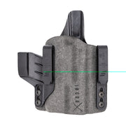 The Incog X is compatible with any Red Dot Sight (RDS) capable of being installed on the firearm manufacturers slide behind the ejection port (including mounting options using the firearm manufacturers adapter plates). They tested dozens of popular RDS models including larger optics like the Trijicon SRO. The Trijicon SRO requires a slight repositioning of the upper flat clip to eliminate minor interference, but works flawlessly after adjustment. The INCOG-X inside the waistband holster for Glock 17/19 configured for a light. Boltaron construction provides form fitting passive retention. Suede exterior adds extra friction for secure IWB wear. Adjustable clip positioning allows for ride-height adjustment.
