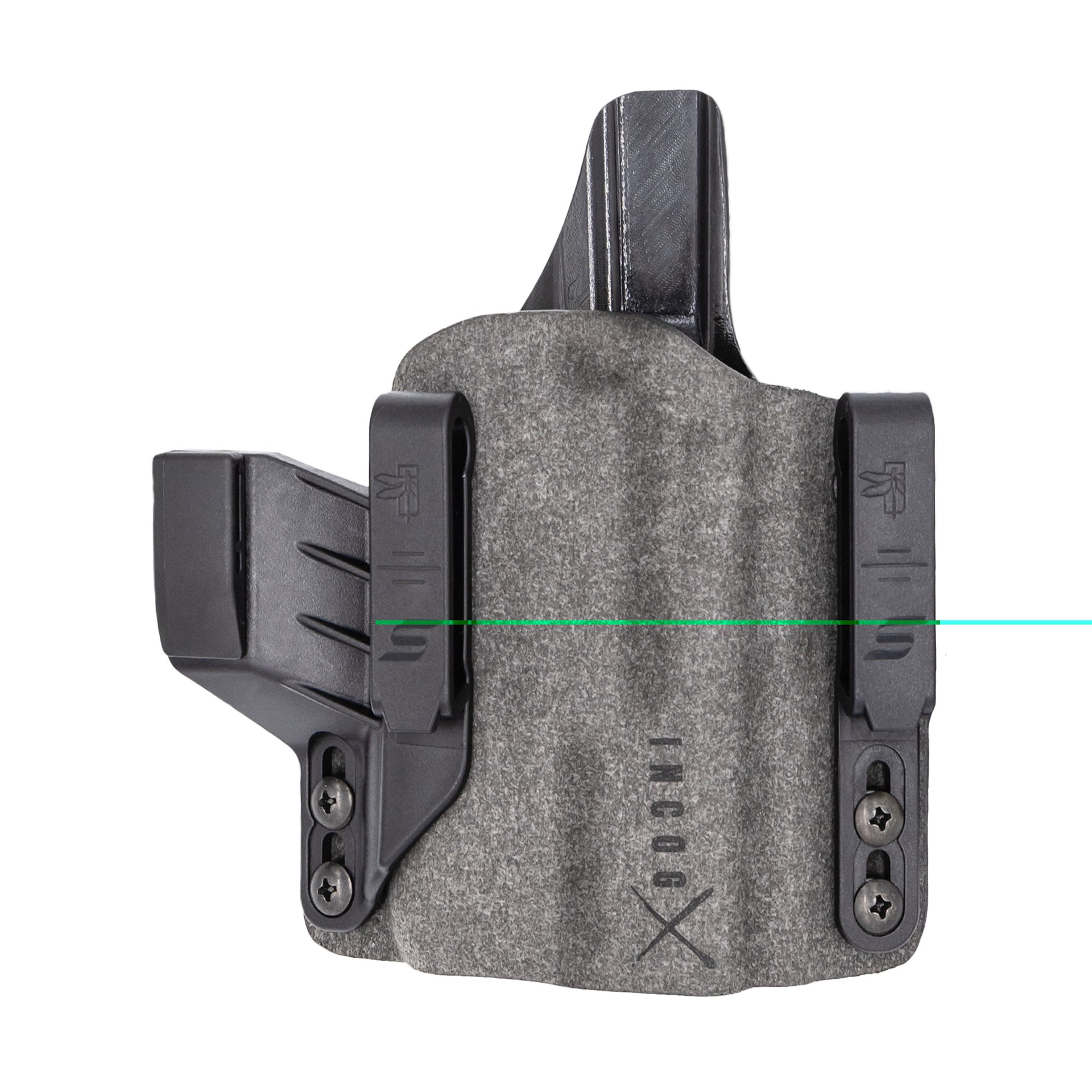 The Incog X is compatible with any Red Dot Sight (RDS) capable of being installed on the firearm manufacturers slide behind the ejection port (including mounting options using the firearm manufacturers adapter plates). They tested dozens of popular RDS models including larger optics like the Trijicon SRO. The Trijicon SRO requires a slight repositioning of the upper flat clip to eliminate minor interference, but works flawlessly after adjustment. The INCOG-X inside the waistband holster for Glock 43x/ 48. Boltaron construction provides form fitting passive retention. Suede exterior adds extra friction for secure IWB wear. Adjustable clip positioning allows for ride-height adjustment.