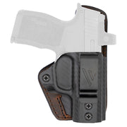 Versacarrys Comfort Flex Custom holster is perfect for those looking to carry everyday and maintain comfort. The holster has a distressed brown leather back paired to a rigid poly front. The holster features a tension adjuster to find the perfect fit and a waistband clip to securely carry your holster.