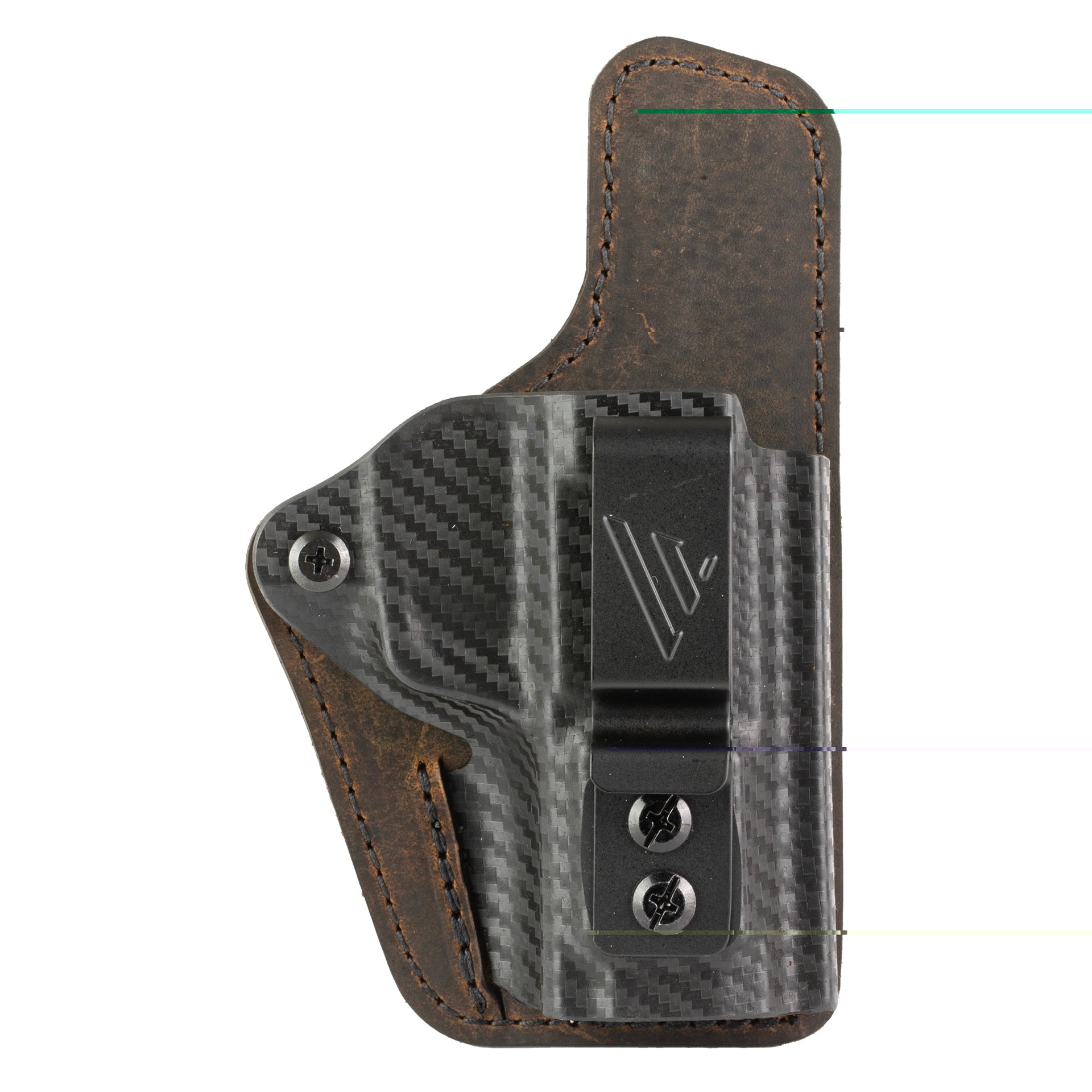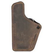 Versacarrys Compound Custom holster is perfect for those looking to carry everyday and maintain comfort. The holster has a distressed brown leather back paired to a rigid polymer front. The holster features a tension adjuster to find the perfect fit and a waistband clip to securely carry your holster.