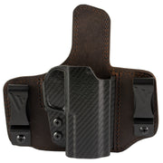 Versacarrys Insurgent Deluxe (IWB/OWB) Holster is perfect for those looking to carry everyday with the ability to use inside or outside waistband carry. The holster has a distressed brown leather back paired to a rigid polymer front.