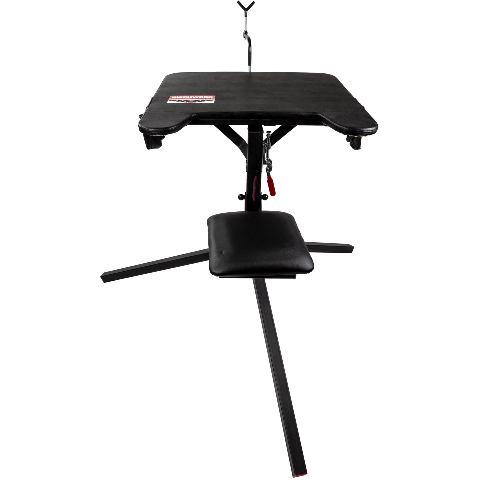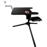 Experience unlimited shooting lanes with this 360 swivel action seat and bench top. 12"W X 14"D X 2" thick seat provides ultimate comfort, while the 29" square bench top with extended arm rests and padded vinyl cover provide all day comfort while shooting. Two shell/gear pouches are an added feature with an adjustable, coated gun-rest to accommodate any hunter. Weight rating is 300lbs. and the bench weighs 38lbs.