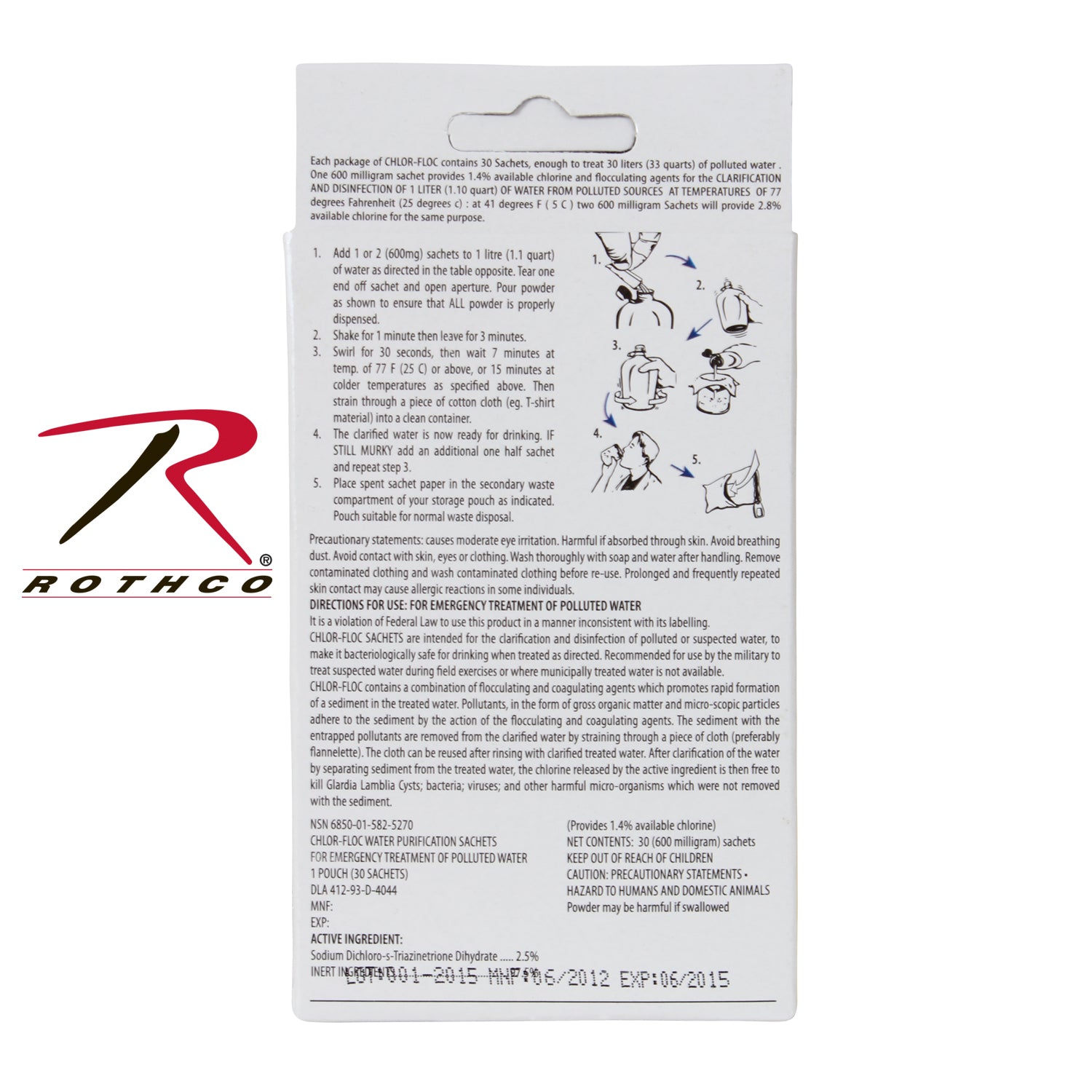 Protect your hydration with Chlor Floc active-duty Water Purification Powder. Trusted by active-duty personnel, campers, and preppers alike, these packets effectively eliminate Giardia, bacteria, viruses, and sediment from your water, ensuring safe drinking. Each box contains 30 packets, treating up to 8 gallons of water. Simply add 1 or 2 packs, depending on water temperature, to 1 liter of water. These active-duty-grade purification tablets are instrumental in the removal of sediment and are used by the U.S. military. With a shelf life of up to 3 years, you can rely on Chlor Floc for safe drinking water whenever you need it most.