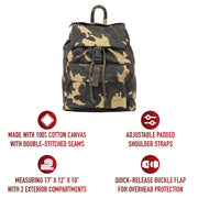 - The quick-release buckle flap provides overhead protection, allowing your possessions to remain dry and out of sight. The canvas backpack also utilizes a drawstring closure that keeps your gear tucked away inside.