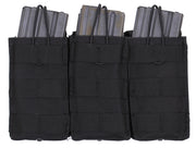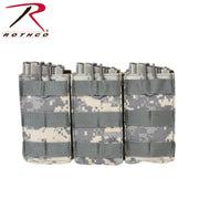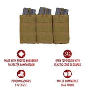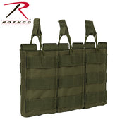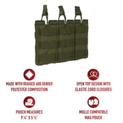 Elevate your tactical gear with Rothco’s MOLLE Open Top Triple Mag Pouch, the ultimate solution for carrying extra rifle mags. Crafted for versatility and durability, this pouch seamlessly integrates with your MOLLE-compatible plate carrier vest, tactical pack, or any gear featuring a MOLLE panel. Designed to accommodate 3 rifle mags, including AK-47 and M-16 magazines, it ensures you have quick and convenient access to ammunition when you need it most. The open-top design with elastic cord closures enables rapid reloading during critical moments. Constructed from rugged 600 Denier polyester, this pouch withstands the rigors of outdoor environments and tactical operations, ensuring long-lasting performance. Its compact dimensions, measuring 9 ¼ inches X 5 ½ inches, provide high-capacity storage without adding unnecessary bulk. Additionally, grommet drainage holes prevent moisture buildup, enhancing durability in adverse conditions. Whether you're on duty or engaged in recreational activities like airsoft or paintball, this triple mag pouch is an essential addition to your loadout. Versatile and dependable, it offers a secure and accessible solution for carrying your essential rifle magazines.