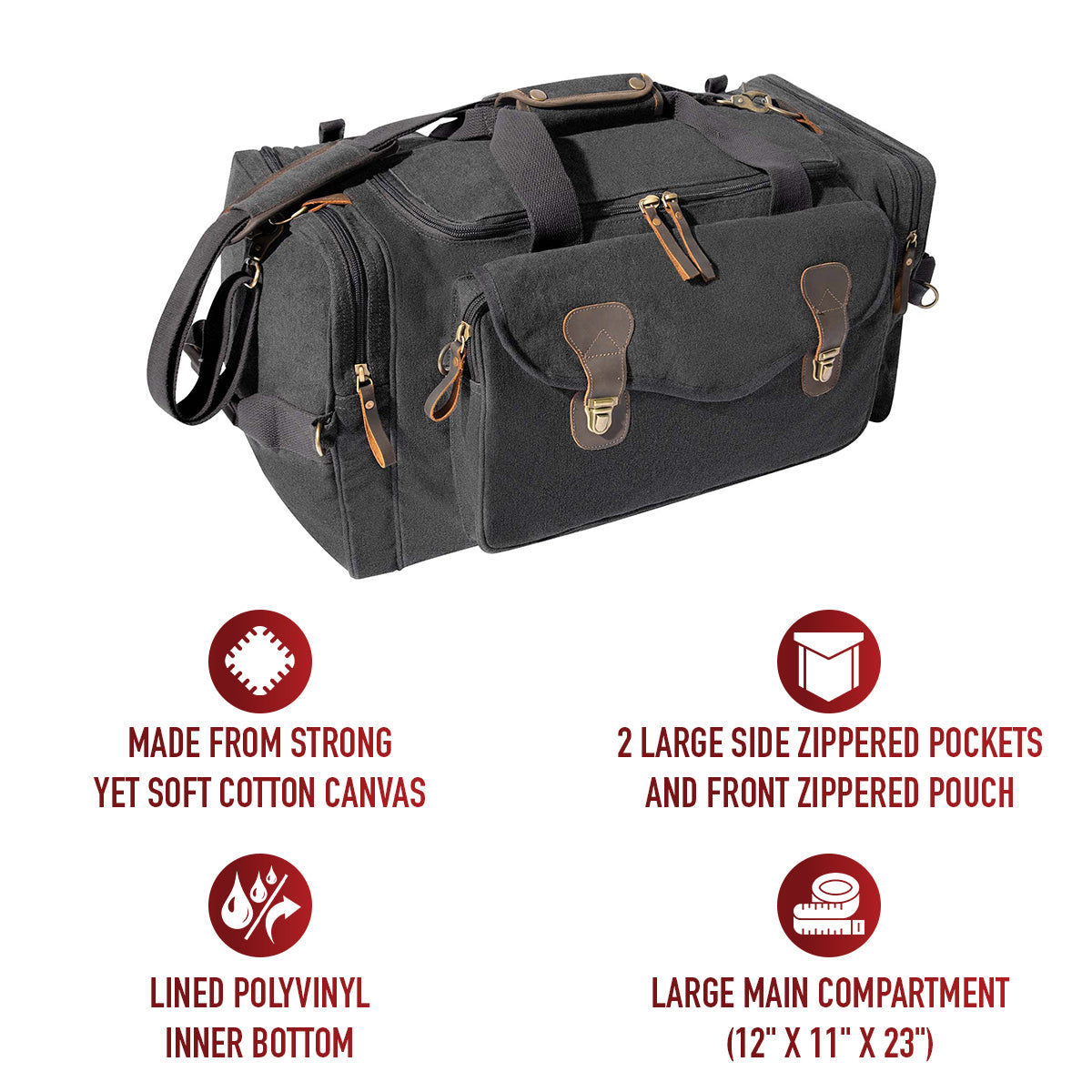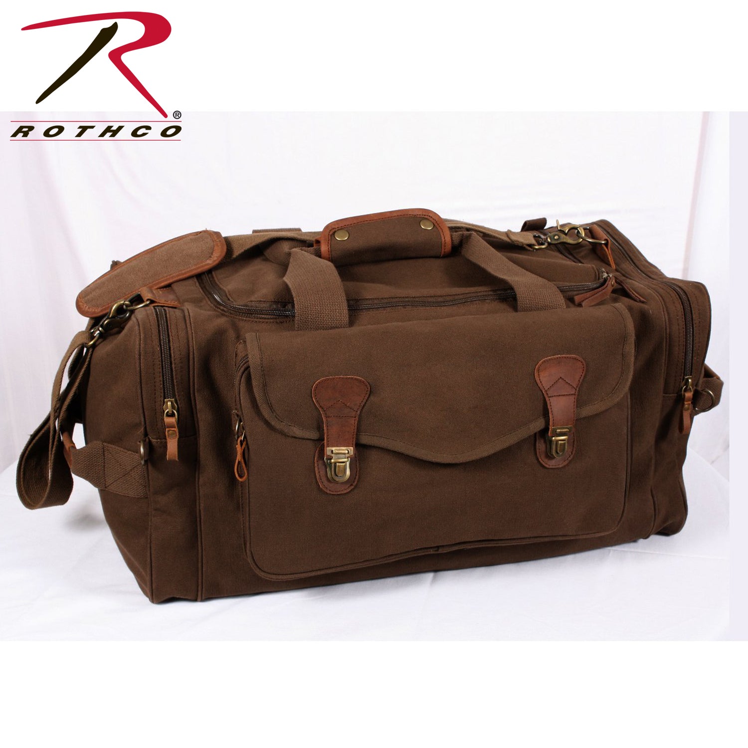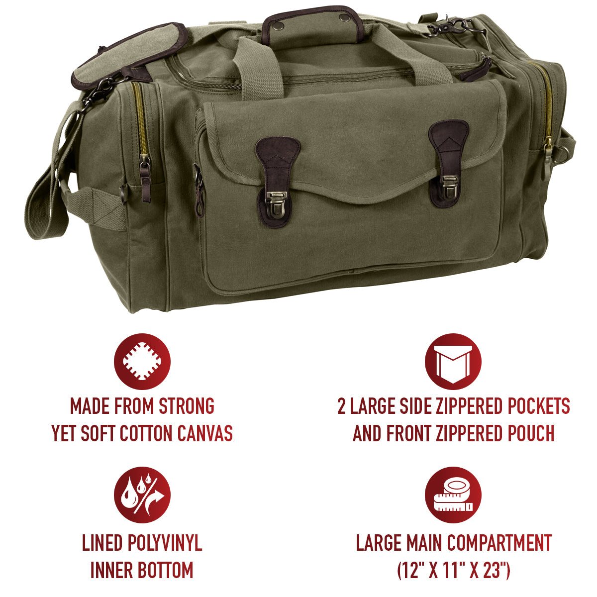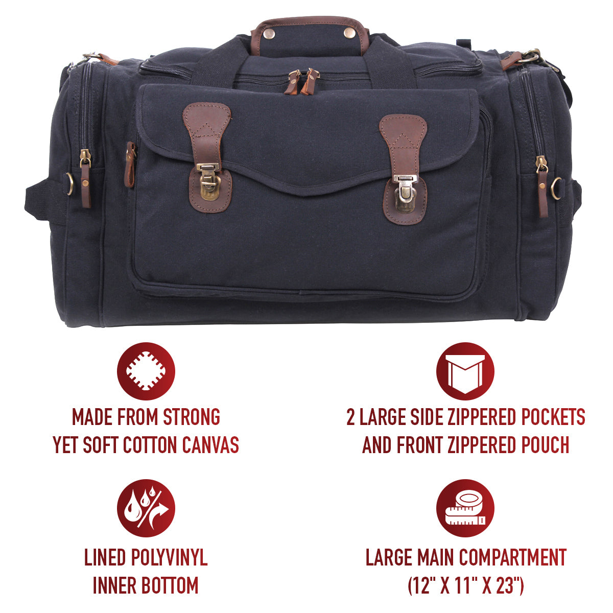 Experience the perfect blend of style and functionality with Rothco's Canvas Long Weekend Bag. Designed for your getaway essentials, this bag features a large main compartment measuring 12 inch x 11 inch x 23 inch, ensuring ample space for your next adventure. Constructed from robust yet soft cotton canvas, it offers long-lasting durability. The lined polyvinyl inner bottom protects your belongings from getting wet. 2 large side zippered pockets provide convenient storage for toiletries, shoes, and electronics, while the front zippered pouch with flap and push-button buckles keeps important travel documents safe and easily accessible on the go. The reinforced top and dual side carry handles, adorned with leather trim, add a touch of sophistication. Leather zipper pulls and accents complete the look, making it a stylish travel companion. Versatile and practical, this bag is perfect for weekend trips and makes an excellent gift. Its spacious design is suitable for screen printing and embroidery, allowing you to personalize it with your unique style. Made from Rothco’s durable heavyweight canvas fabric, this superior material is naturally water-resistant, rugged, and is built for the long haul. No one comes close to Rothco’s collection of ultra-premium canvas bags and packs.