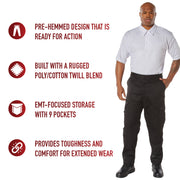 Our EMT Pants are specially designed to provide first responders with the function, comfort, and protection they need on the job. These cargo work pants are built to last through the toughest circumstances and emergencies. In addition, the medical uniform pants are designed with comfort and durability in mind, allowing you to focus on the situation at hand. Professional Design: These EMS pants provide the flexible toughness you need on the job. With pre-hemmed legs, reinforced knees, adjustable waist tabs, and ankle drawstring, you’ll be able to find the perfect fit while maintaining a professional look. Utility Pockets: Be prepared for anything with the EMT work pants’ 9-pocket design: 2 large bellow cargo pockets (with vertical instrument pocket on the right leg pocket), 2 large-capacity back pockets, 2 front slash pockets, and 2 ankle bellow pockets for carrying scissors, flashlights, medical gear, emergency supplies, work essentials, and more. Secure Fit: The EMT cargo pants feature a comfortable waist closure with a zipper fly and snap-button for all-day comfort while out on the job. First Responder-Focused: Rothco carries a massive selection of EMT, EMS, and first responder clothing and gear that is specially designed to support the crucial, fast-paced tasks medical professionals face on the job.