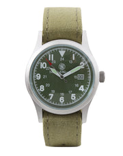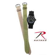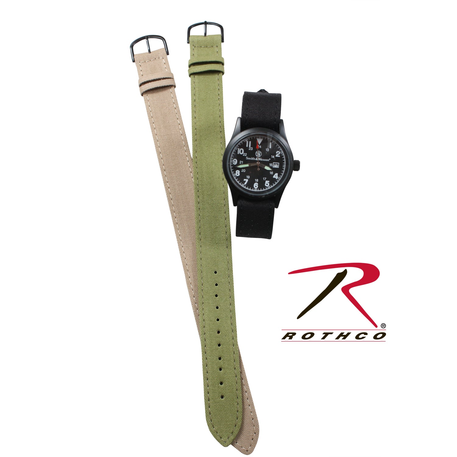 The Smith & Wesson Military Watch Set is designed for those who demand both style and durability. This versatile watch set includes 3 interchangeable heavy-duty canvas watch bands in olive drab, black, and khaki, allowing you to maintain a professional look that matches your uniform or outfit. The watch features a round face with a black backing, showcasing the well-respected Smith & Wesson name and logo. It includes 3 luminous hands that display hours, minutes, and seconds, as well as a date display to keep you punctual. Constructed with a durable stainless-steel back and protected by a hardened mineral glass crystal, the watch is built to withstand rugged use. It operates on precision Japanese quartz movement and is powered by a long-lasting silver oxide battery. Water-resistant up to 30 meters, this watch is a reliable companion for adventurers and professionals alike.