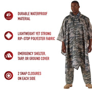 Prepare for any weather with our Rip-Stop Poncho. Engineered with durable polyester rip-stop fabric, the military poncho shields against wet weather while withstanding harsh terrain, ensuring long-lasting use while outdoors. The rain poncho is great for field use, bug-out bags, and emergency situations. Available in solid colors and camouflage patterns for varied preferences. Waterproof Protection: The emergency poncho features an adjustable drawstring hood and dual 2-snap side closures for extra defense against the rain and wind. Multifunctional Design: The hooded poncho comes equipped with grommeted corners, allowing you to use the hunting poncho as an emergency shelter during survival situations. Measuring 56 inch x 90 inch, the rip-stop poncho can double as a tarp or ground cover, adding versatility to your outdoor gear. One Size Fits Most: These adult raincoats are for both men and women, ensuring a comfortable fit while also offering additional space for covering a backpack or crossbody bag. Adventure Ready: From weekend getaways to daily commutes, the rip-stop rain jacket offers a quick solution to sudden downpours, and is ideal for camping, hiking, fishing, hunting, traveling, and other outdoor activities.