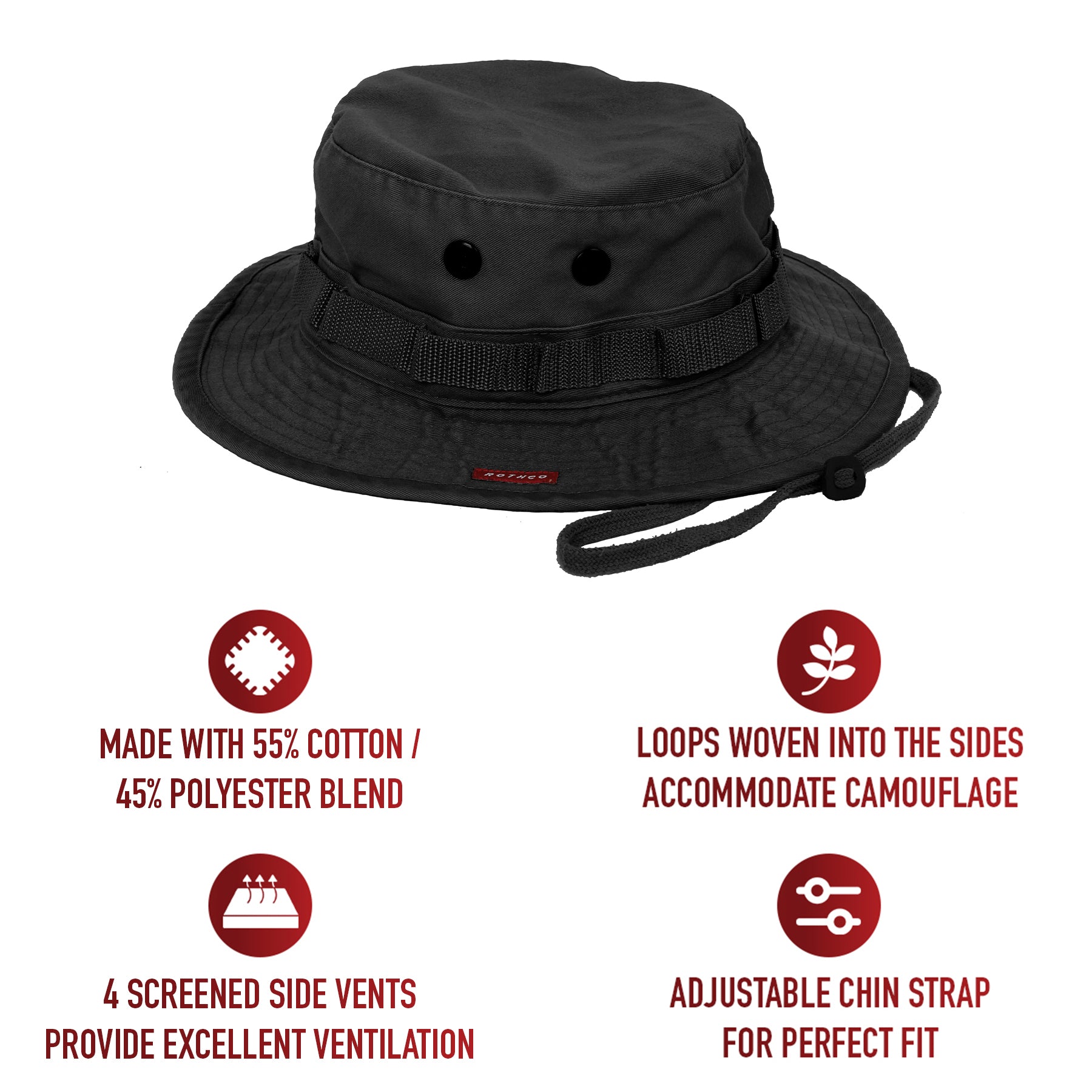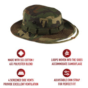 Rothco's Vintage Boonie Hat offers classic field-proven features with a vintage washed cotton/poly twill construction. Lightweight and breathable, the bucket hat efficiently absorbs and dries sweat for maximum comfort. The wide brim provides protection from direct sunlight, while the hang ties ensure a secure fit around the chin, ideal for most head sizes. Perfect for outdoor activities such as camping, hunting, hiking, fishing, and traveling, this robust boonie hat can be folded up for convenient carry while retaining its shape. Keep your head in the game with Rothco’s collection of headwear and accessories. Designed with precision and purpose, our headgear is built to withstand the harshest conditions. Whether you’re tackling the cold in one of our Watch Caps or Balaclavas, or out on a mission in a Boonie Hat or Fatigue Cap, our diverse range of headwear provides unmatched comfort and protection for everyone from military personnel to outdoor enthusiasts.