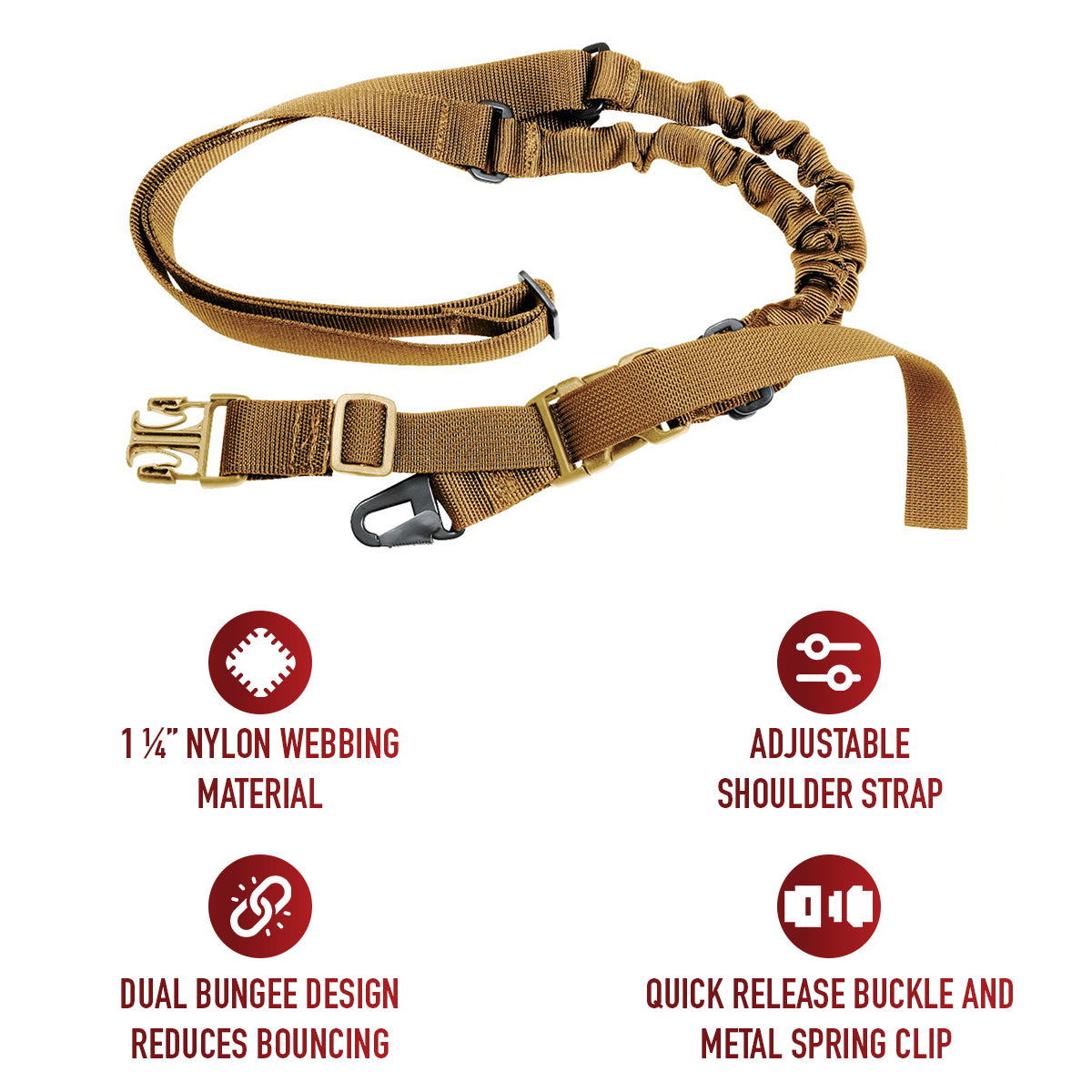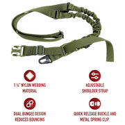 Upgrade your tactical gear with Rothco’s Single Point Rifle Sling. Crafted from durable nylon webbing, the tactical sling features fully adjustable shoulder straps and dual bungee cords to minimize bouncing and secure your firearm. Equipped with a quick-release buckle and metal spring clip for easy attachment. Adjustable shoulder strap offers versatility, ranging from 42 inch to 64 inch.