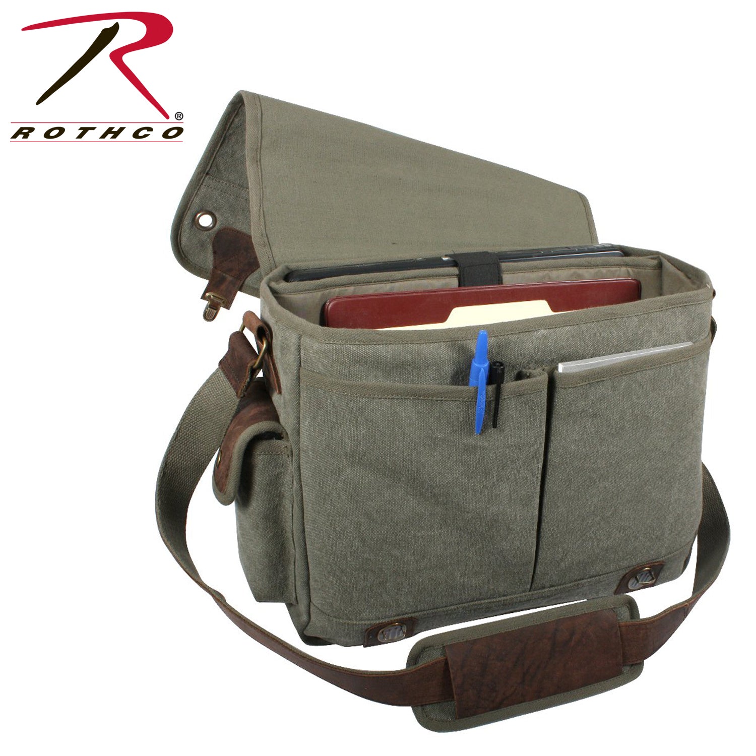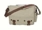 Rothco's Trailblazer Laptop Bag is a perfect blend of durability and style, designed for the modern adventurer. Constructed from heavyweight washed canvas, this laptop bag is built to withstand the rigors of daily use while providing a vintage aesthetic. Leather accents add a touch of sophistication, making it suitable for both casual and professional settings. The padded interior features a stretch strap that securely holds your laptop or other electronic devices, ensuring they remain safe during transport. The front flap, equipped with 4 large brass grommets, adds a rugged touch while keeping the crossbody bag securely closed. Underneath the flap, you'll find 2 additional front pockets, perfect for organizing smaller items like chargers, notebooks, or your phone. A side pocket with a canvas brown leather flap and brass snap provides extra storage, making this bag as functional as it is stylish. The leather-topped carry handle and adjustable padded shoulder strap offer comfort and versatility, whether you're heading to work or exploring new trails. Made from Rothco’s durable heavyweight canvas fabric, this superior material is naturally water-resistant, rugged, and is built for the long haul. No one comes close to Rothco’s collection of ultra-premium canvas bags and packs.