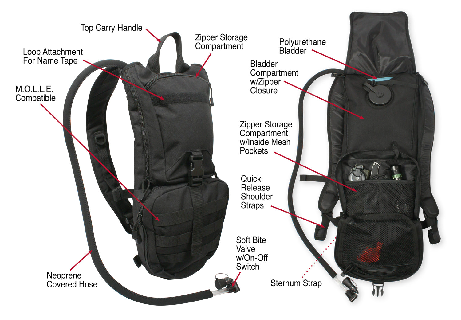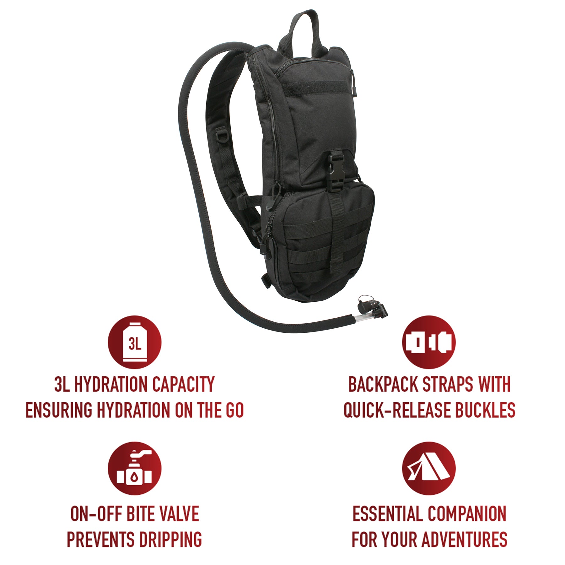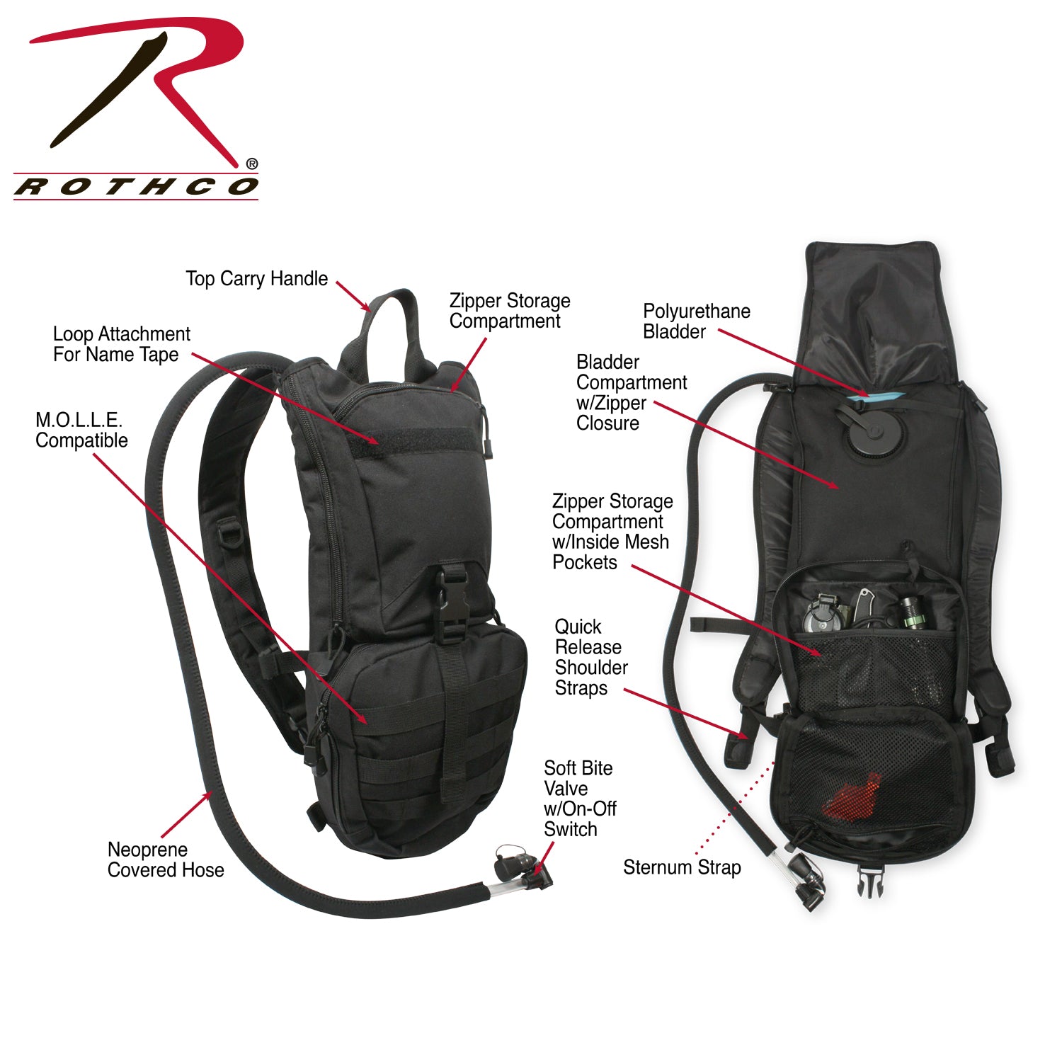 Stay prepared and well equipped with Rothco’s Rapid Trek Hydration Pack. This hydration pack offers essential features for outdoor enthusiasts and active-duty personnel. With a 3-liter bladder and MOLLE compatibility, stay hydrated while on-the-go. The neoprene-covered hose includes a bite valve with an on-off switch for easy drinking, while the quick-release shoulder straps and sternum strap provide a secure fit. The outdoor pack features a top carry handle for convenience and a zipper-close bladder compartment for easy access. The front storage compartment with zipper closure offers additional space for essentials. Additionally, the 2 bottom d-rings offer extra gear attachment while the loop field allows you to attach name tape or badge for added versatility.