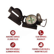 Embark on your outdoor journeys with confidence using Rothco's Military Marching Compass. Designed for military use, this compass is a reliable navigation tool for active-duty personnel, adventurers, hikers, campers, and outdoor enthusiasts. Constructed with precision and durability in mind, Rothco's Military Marching Compass features a liquid-filled design that minimizes excessive swing or wobble, ensuring optimal accuracy even in challenging terrain or conditions. This fluid enhances readability and protects the compass's internal mechanisms from wear and tear during extended use. Equipped with essential navigational aids, this compass includes a slide ruler for precise measurements and calculations, allowing you to plot your course with accuracy. The integrated magnifying glass provides clear visibility of map details and fine print, enhancing your ability to interpret topographic maps or trail guides. Crafted with an aluminum cast case, Rothco's Military Compass is built to withstand rugged outdoor environments, ensuring reliable performance in any situation. Its sturdy construction offers protection against impacts, bumps, and other hazards encountered during outdoor expeditions. Available in three distinct colors, including black, olive drab, and coyote brown, the compass allows you to choose the option that best suits your preferences or blends seamlessly with your outdoor gear and apparel. Whether you're embarking on a hiking expedition, navigating unfamiliar terrain, or exploring the great outdoors, Rothco's Marching Compass is an essential tool for ensuring you stay on course and reach your destination safely. With its durable construction, reliable performance, and versatile features, this compass is a must-have addition to your outdoor gear collection.