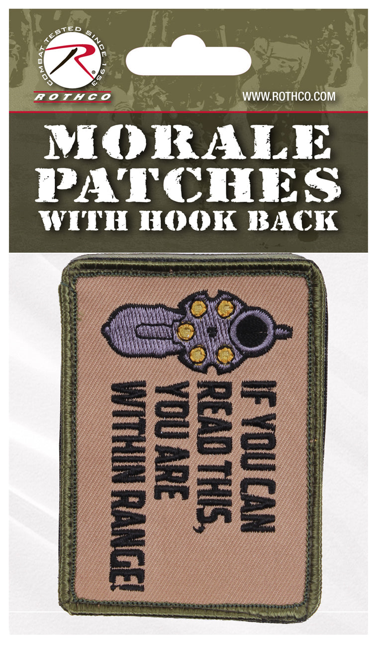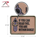 Let your foe know where you stand with Rothco's "If You Can Read This, You Are Within Range" Patch. The 2.5" X 3.5" patch features a hook backing for easy attaching to tactical caps or combat shirts.Patches with the item #’s starting with ‘P’ are individually packaged with a header card.