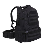 Rothco's Multi-Chamber MOLLE Assault Pack offers extensive storage with 7 compartments, including a hidden laptop pocket. Made of durable polyester, it's perfect for outdoor adventures. The large main compartment features a mesh zippered pouch and a hydration pocket with bladder attachment points. Additionally, it has front zipper organizer pockets, twin zipper side pouches, and a top zipper pocket for easy access to essentials. The padded back includes a rear zipper laptop compartment, and adjustable padded shoulder straps ensure comfortable wear. With top and twin side carry handles, it provides alternative carry capability, while the waist strap with 1 inch x 3 inch ID window adds convenience. Plus, 4 side cinch straps with quick-release buckles ensure a secure fit.