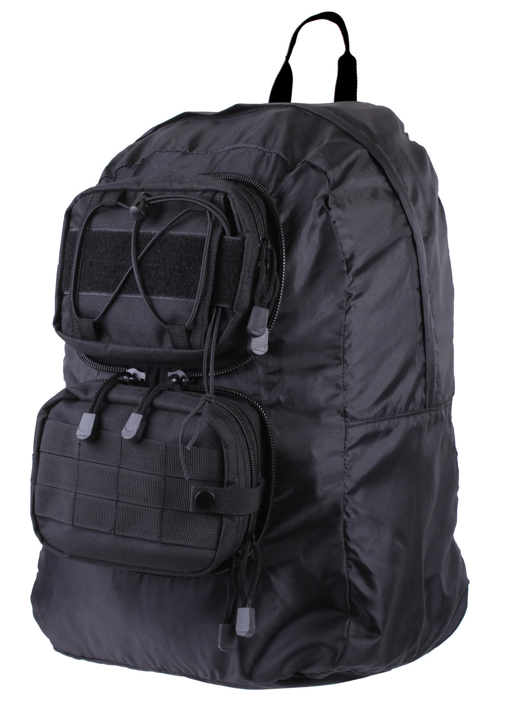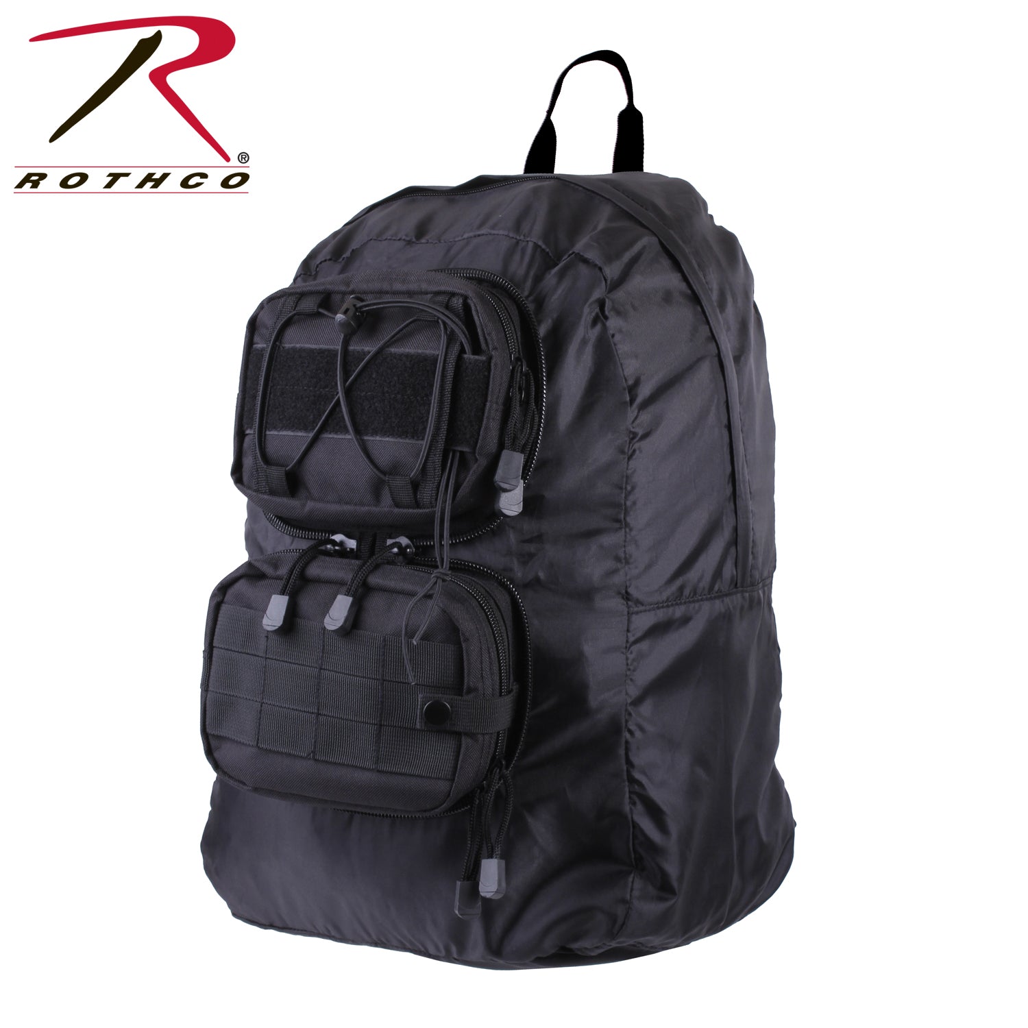 Rothco's Tactical Foldable Backpack converts from a 5" x 5" x 4.75" storable pouch, into a fully functional 11.75" x 7" x 18" backpack complete with hydration and MOLLE compatibility. The pouch acts as front compartments for the pack when it's fully opened, designed to store away when not required and provide extra capacity when needed. Features include 31" adjustable backpack straps, a 8.5" top carry handle, hydration compartment, MOLLE loops, and elastic cord cinch area.