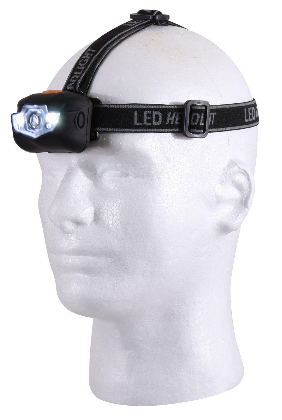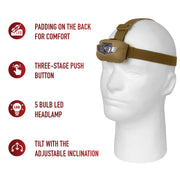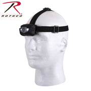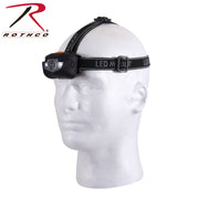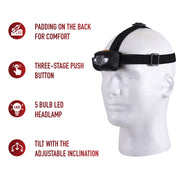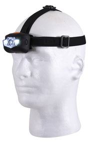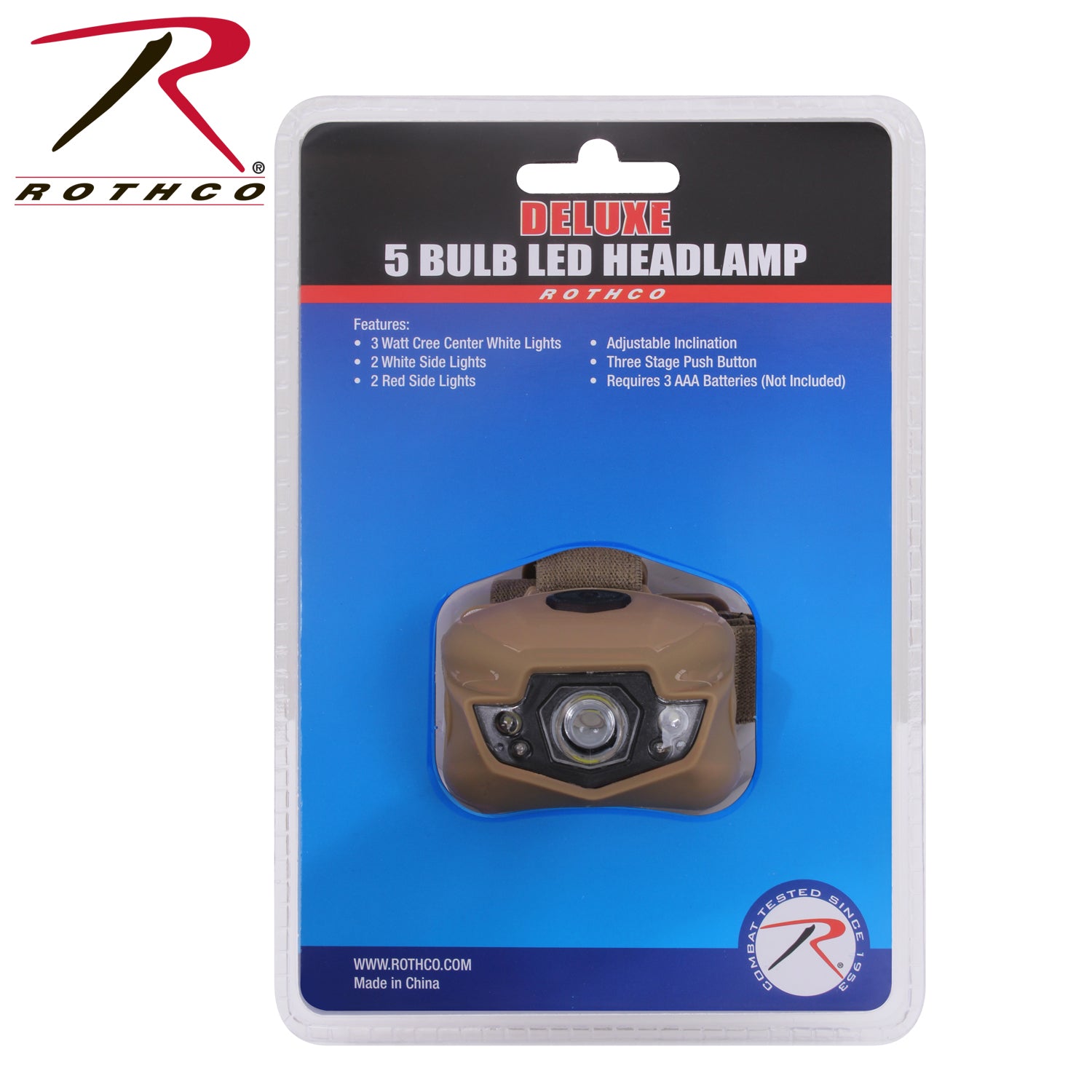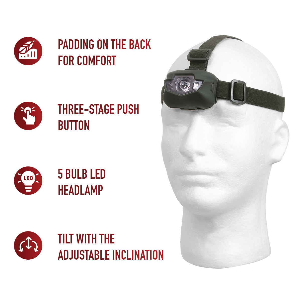 Illuminate your path with Rothco's Multi-Function 5 Bulb LED Headlamp. Designed for versatility, it features a three-stage push button, offering a 3-watt Cree center white light, 2 side white lights, and 2 side red lights, making it ideal for service, police, and outdoor enthusiasts. The headlamp is adjustable in different directions, providing a customized beam of light. The LED headlight body features padding on the back for enhanced comfort during extended use. Compact in size (2.2" x 1.7" x 1.5"), it's perfect for law enforcement officials, cyclists, and outdoorsmen. A comfortable fit is ensured with the adjustable elastic strap, allowing you to focus on your tasks hands-free. The headlamp requires 3 AAA batteries (not included), providing a reliable and long-lasting source of illumination making it ideal for public safety, first responders, and outdoor enthusiasts.