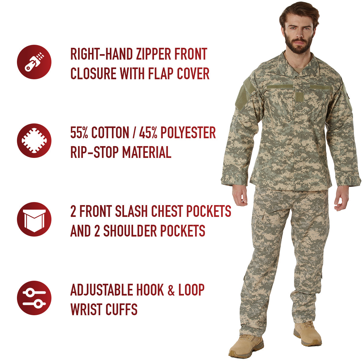 Gear up with our ACU Digital Camo Combat Uniform Shirt. Featuring the Army Combat Uniform (ACU) digital camo pattern and near-military specifications, these uniform shirts are great for active-duty personnel, camo enthusiasts, and more. The resilient cotton / polyester rip-stop fabric allows the combat shirt to withstand training sessions and various outdoor conditions. High-Capacity Storage: The camouflage miliary shirt comes equipped with 2 front chest pockets, 2 shoulder pockets (pen pocket on left sleeve), and elbow pad pouches (pads sold separately) for storing field gear and essentials. Customization Options: In addition to the 2 hook & loop fields on the shoulders, the long sleeve combat shirt features a name tape holder on the right chest, military branch tape holder on the left chest, and rank insignia holder in the center chest. Utility at the Forefront: The ACU camo shirt features a mandarin collar, which helps protect your neck from chafing, especially when wearing body armor. The front zipper with flap closure offers additional coverage, while the adjustable wrist cuffs offer the perfect fit. All Things Camo: Rothco stands out as the leader in camouflage clothing and accessories. With a rich heritage spanning over six decades, we have honed our expertise in crafting durable and effective camouflage gear. Our extensive range of products, including apparel, bags, and gear, showcases a diverse selection of camouflage, with over 35 patterns available! From outdoor enthusiasts and military personnel, to skate and fashion, Rothco is the go-to brand for camo.
