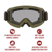 Upgrade your tactical loadout with our ANSI Rated OTG Goggles. From military personnel to shooting sport professionals, the high-performance goggles shield your eyes from dirt and debris while ensuring top-tier impact protection out in the field. The goggles meet ANSI Z87-1 and MIL-DTL-43511D standards. Trust in Rothco's commitment to quality for unparalleled eye protection in challenging environments. Over-The-Glasses Design: These tactical goggles feature a 7/8-inch temple cutout on each side that fits over glasses, sunglasses, and prescription eyewear. The 3/8-inch foam padding creates an additional seal while remaining comfortable against skin. Premium Lens Quality: The tactical OTG goggles come equipped with 2mm thick polycarbonate lenses that offer anti-fog, anti-scratch, and UV 400 protection for years of reliable use in any weather or lighting conditions. The military goggles come with a cleaning cloth and cover. Tactical Utility: The protective goggles feature a dual ventilation system that utilizes top and bottom vents, preventing the lenses from fogging over while delivering optimal airflow for breathability. The movable dynamic hinges and adjustable strap with rubber grip allows you to comfortably wear the airsoft goggles with a variety of tactical helmets while ensuring it stays in place. Ready for Action: Whether you are heading out to the range or out on a mission, the shooting safety goggles are great for tactical operations, field use, airsoft, paintball, shooting competitions, hunting, and other outdoor activities.