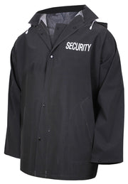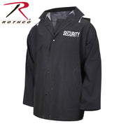 Stay cool and dry with Rothco’s Security Rain Jacket. Features “SECURITY” text, ventilation slots, and a detachable hood. Ideal for security professionals in any weather condition. Rothco’s Security Rain Jacket ensures security professionals stay dry and comfortable during outdoor duty in inclement weather. Constructed from lightweight and water-resistant material, this jacket provides reliable protection against rain while offering enhanced breathability for all-day wear. Featuring the bold "SECURITY" text printed on the front left chest and center back, this jacket ensures clear identification and professional appearance. The ventilation slots strategically placed under the arms and on the back allow air circulation to prevent overheating, keeping you cool and dry even during prolonged wear. The jacket comes equipped with a detachable hood, providing versatility to adapt to changing weather conditions. The hood can be easily removed using snap closures when not needed, offering convenience and customization. For added convenience, the jacket features a 4-snap front closure, allowing for quick and effortless wear and removal. Additionally, the snap sleeve closure enables you to adjust the cuffs for increased ventilation or a snug fit, depending on your preference. Whether you're patrolling outdoor venues, monitoring events, or performing security duties in adverse weather conditions, Rothco’s Security Rain Jacket offers the durability, functionality, and comfort essential for security professionals. Stay protected and maintain a professional appearance with this essential outerwear piece.