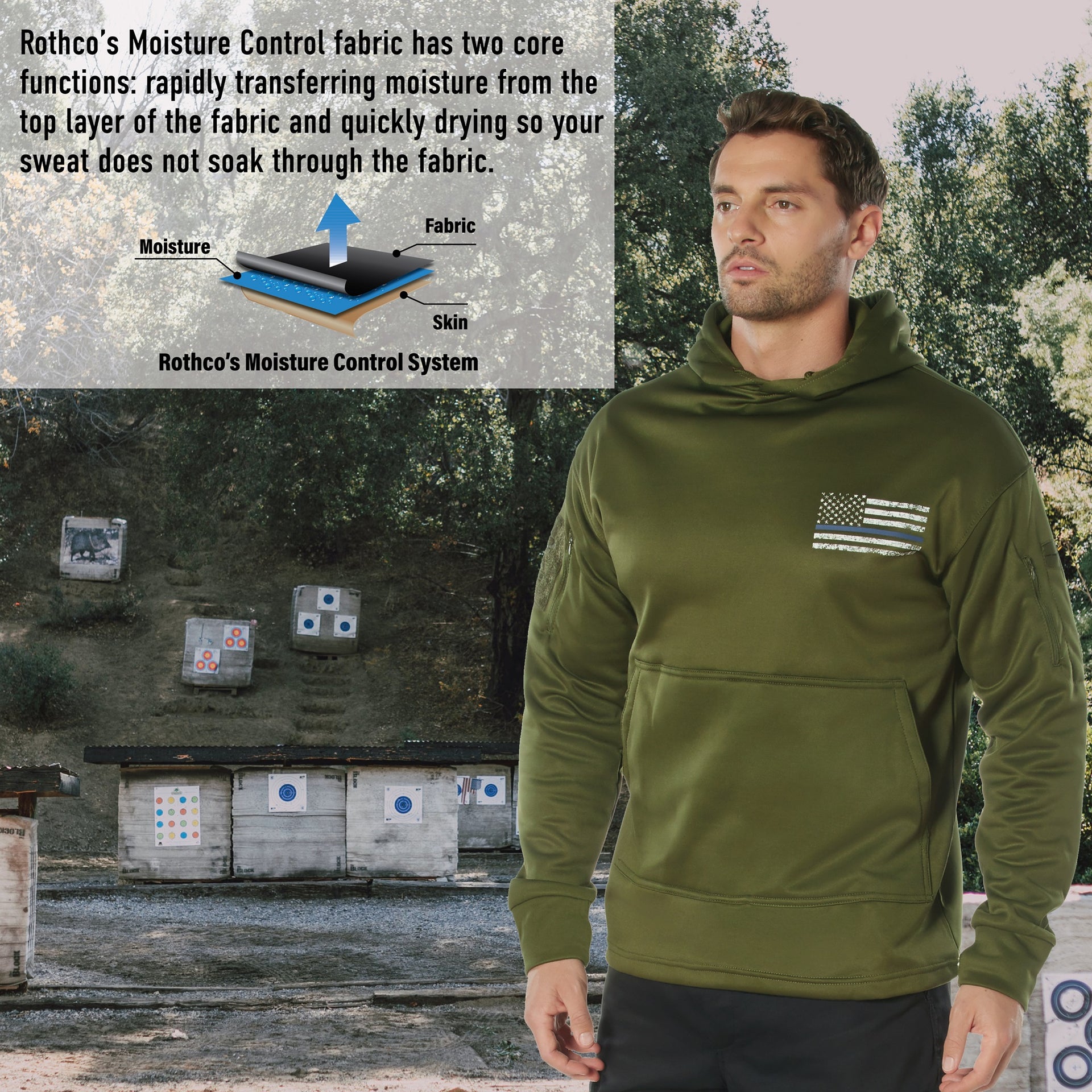Our Concealed Carry Thin Blue Line Hoodie features a distressed American Flag graphic on the left chest and across the back, showing respect and support first responders, law enforcement officials, and police. This hoodie sweatshirt also offers best-in-class discrete carry while providing unbeatable warmth and comfort. Whether you're out on a weekend trip or just running errands around town, this hoodie has everything you need to stay comfortable and prepared. Discrete & Fast: The passthrough kangaroo pocket allows for quick and easy access to your IWB for appendix carry. In addition, the 8.25 inch internal vertical access point ensures that most standard EDC (Everyday Carry) essentials will fit comfortably. Staying Cool and Dry: Made of 100% polyester, these CCW hoodies wick sweat and moisture away for optimum comfort. Featuring our rapid moisture control fabric, sweat is swiftly transferred to the top layer, allowing for a quick dry. This prevents sweat from soaking through the moisture-wicking hoodie and back into your undershirt, allowing you to move freely without your clothing sticking to you. These comfortable hoodies are perfect for both normal everyday wear and for those who work in public safety. Secure Storage: The pullover hoodie also features two zippered sleeve pockets with wire passthrough ports, allowing you to safely tuck away your phone, wallet, or other everyday carry items. The right sleeve includes a dual pen pocket for keeping writing utensils, while the left sleeve features a loop panel for adding morale and flag patches. Warm & Comfortable: With a soft fleece lining, these pullover hooded sweatshirts offer all-day (and all-night) comfort. The drawstring hood keeps your head and neck warm while protecting you against cold wind and rain. The built-in thumbholes preserve your hands’ heat without sacrificing your mobility and range of motion. A Helping Hand: Proceeds from the sale of our Thin Blue Line items benefit the families of fallen first responders through our partnership with Answer The Call, also known as the New York Police and Fire Widows’ and Children’s Benefit Fund. Discreetly Carry in Confidence: Rothco stands out as the leader in concealed carry clothing and accessories. With a rich heritage spanning over 7 decades, we have honed our expertise in crafting durable and effective CCW gear. Our extensive range of products, including apparel, bags, and gear, showcases a diverse selection of specialized concealed carry items. From public safety and military personnel, to privately armed citizens, Rothco is the go-to brand for concealed carry apparel and gear.