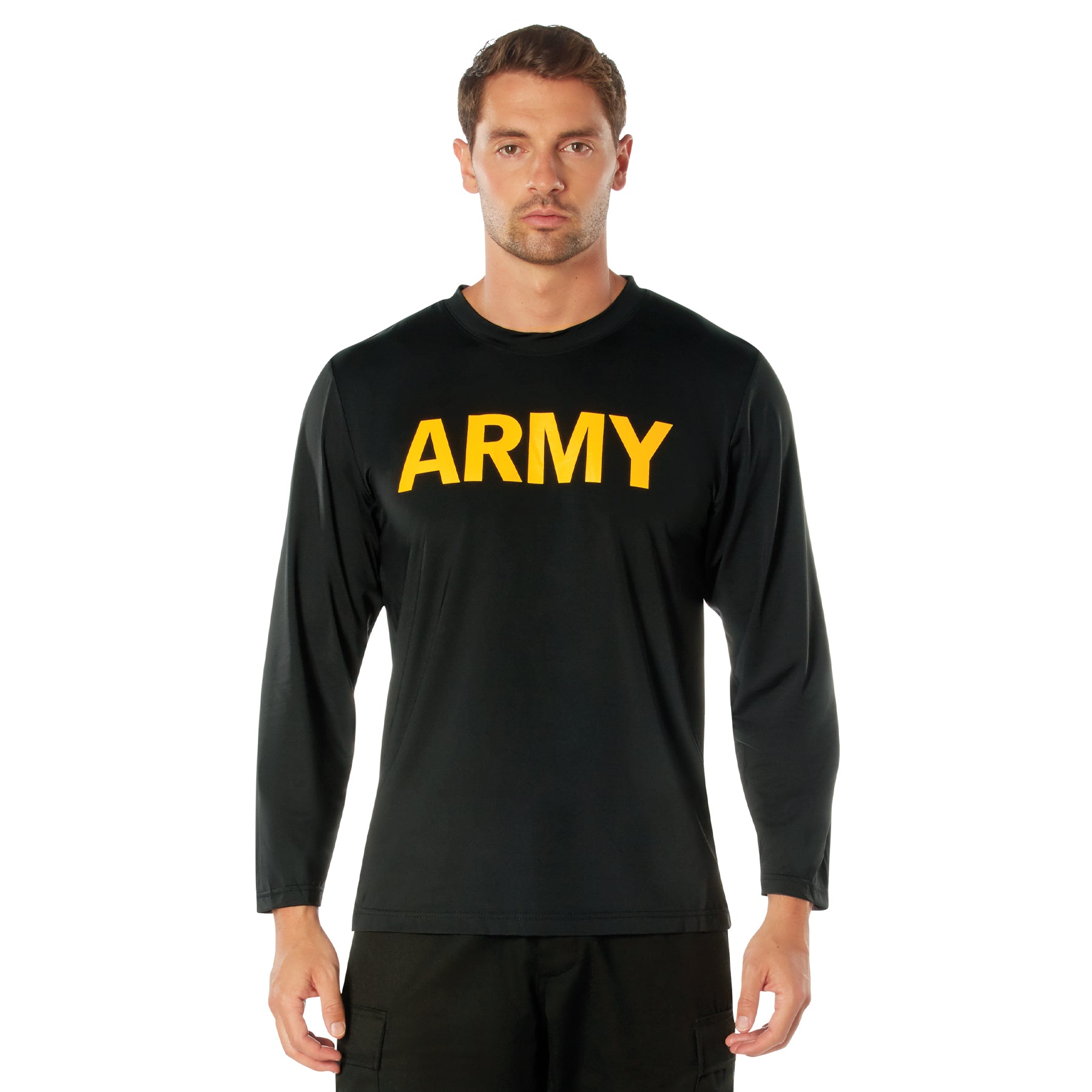 Rothco's Long Sleeve Physical Training Shirt is designed for ultimate comfort and performance. Made from an 86% nylon / 14% spandex blend, this PT shirt offers a lightweight and breathable fit that wicks away moisture, keeping you dry during intense workouts. The bold gold "ARMY" lettering across the chest adds a touch of classic military style. This shirt is perfect for physical training, outdoor activities, or casual wear. The long sleeve design provides extra coverage and warmth, making it suitable for cooler weather. Whether you're hitting the gym, going for a run, or just running errands, Rothco's PT Shirt ensures you stay comfortable and stylish. Pair it with Rothco's matching PT shorts to complete the look.