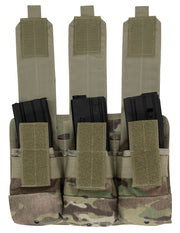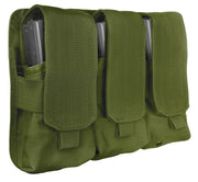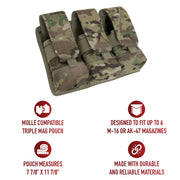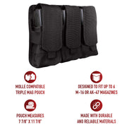 Rothco’s Universal Triple Rifle Magazine Pouch is a versatile solution for securing six M-16 or AK-47 magazines, ensuring readiness at the range or in the field. Constructed with MOLLE compatibility, elastic bands reinforced by hook and loop closures provide dependable retention for your magazines. Designed to fit up to six M-16 or AK-47 magazines, this pouch offers enhanced versatility for various firearms. The MOLLE-compatible design features six straps to securely mount the pouch on plate carrier vests, assault packs, or any gear with a MOLLE panel. Crafted from durable and reliable materials, this pouch is built to withstand rigorous use over time. Additionally, grommet drain holes at the bottom of each pouch prevent water accumulation, ensuring your magazines stay dry and protected. Measuring 7 7/8 inches by 11 7/8 inches, this pouch provides ample storage space while remaining compact and lightweight. Ideal for military personnel, tactical enthusiasts, and law enforcement officials, Rothco’s Universal Triple Rifle Magazine Pouch offers convenience, durability, and versatility for all your ammunition storage needs.