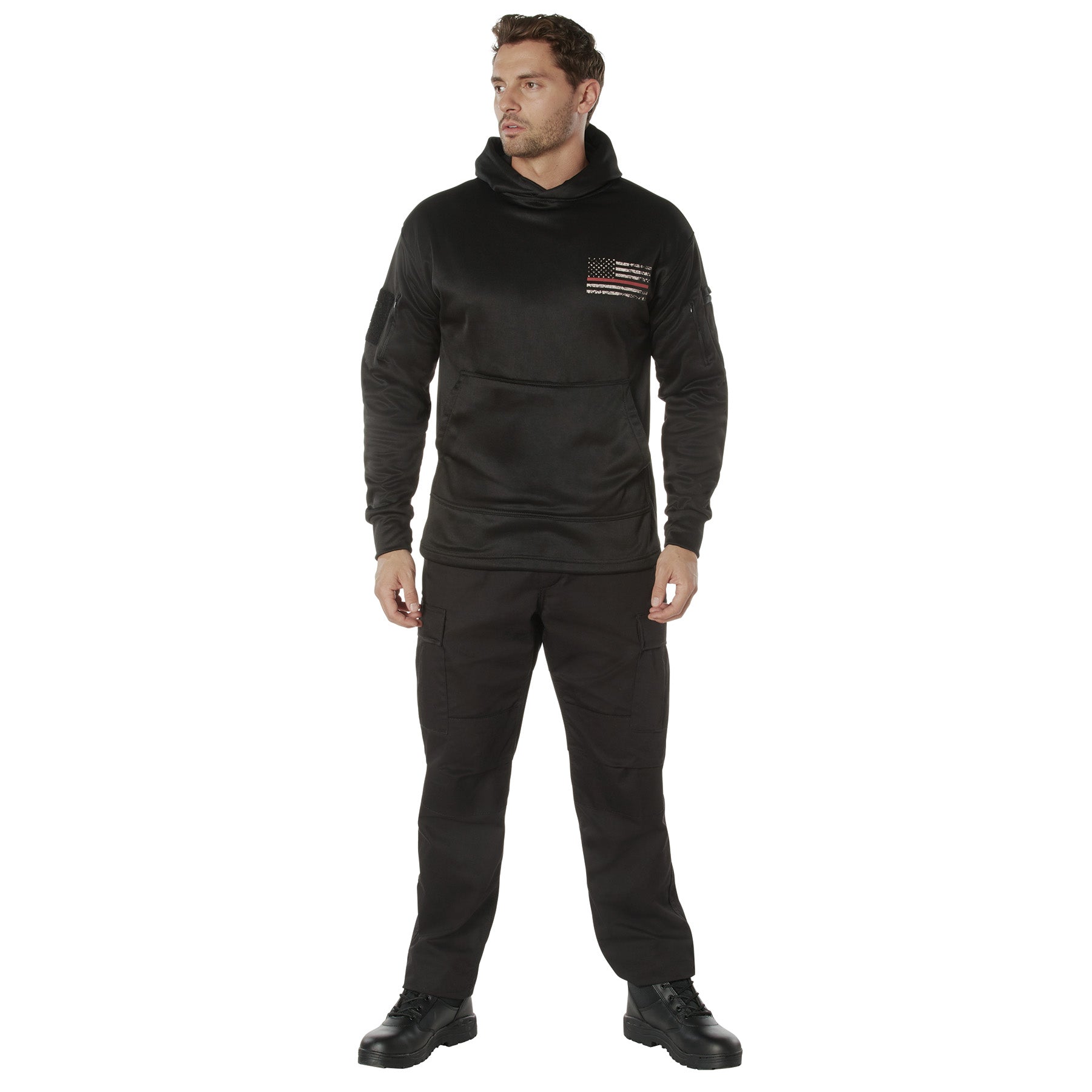 - The pullover hoodie also features two zippered sleeve pockets with wire passthrough ports, allowing you to safely tuck away your phone, wallet, or other everyday carry items. The right sleeve includes a dual pen pocket for keeping writing utensils, while the left sleeve features a loop panel for adding morale and flag patches.