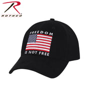 Show your pride and love for America with Rothco’s Freedom Is Not Free Low Profile Cap. The US Flag hat features an embroidered red, white and blue American flag on the center of the buckram front panel with “Freedom” on top of the flag and “Is Not Free” on the bottom. Constructed with lightweight and durable brushed cotton twill and an internal sweatband, the American flag hat is designed to provide superior comfort and prevent sweat from going into your eyes. In addition, the 6 vents holes on top of the low profile ball cap provide optimal breathability to keep your head cool. The United States flag hat can fit most, with an adjustable hook and loop closure to loosen or tighten for the perfect fit. This red, white and blue low profile hat is great for camping, hiking, or any outdoor activity.