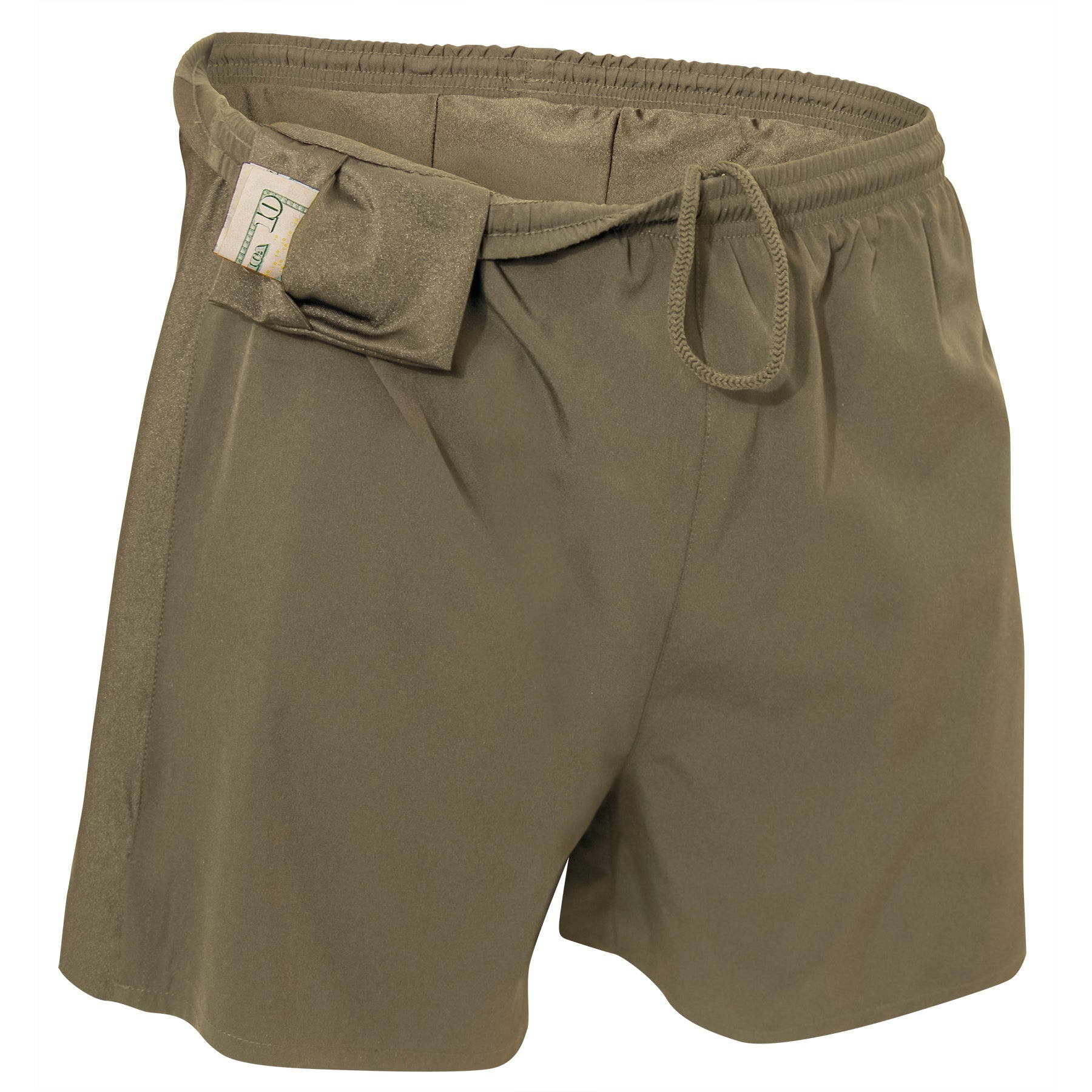 Crafted after the classic PT uniform, these military shorts are designed for high-performance workouts. The moisture-wicking and breathable material composition ensures durability, making them perfect for running, boxing, weightlifting, and more. Featuring stretch side panels and a supportive spandex lining, these shorts provide comfort and flexibility during intense exercises. The hidden waist pocket is convenient for small items, and the boxer-style lining wicks away sweat, complemented by an extra hidden pocket on the left leg. The elastic waistband with a drawstring keeps the shorts secure during dynamic movements.