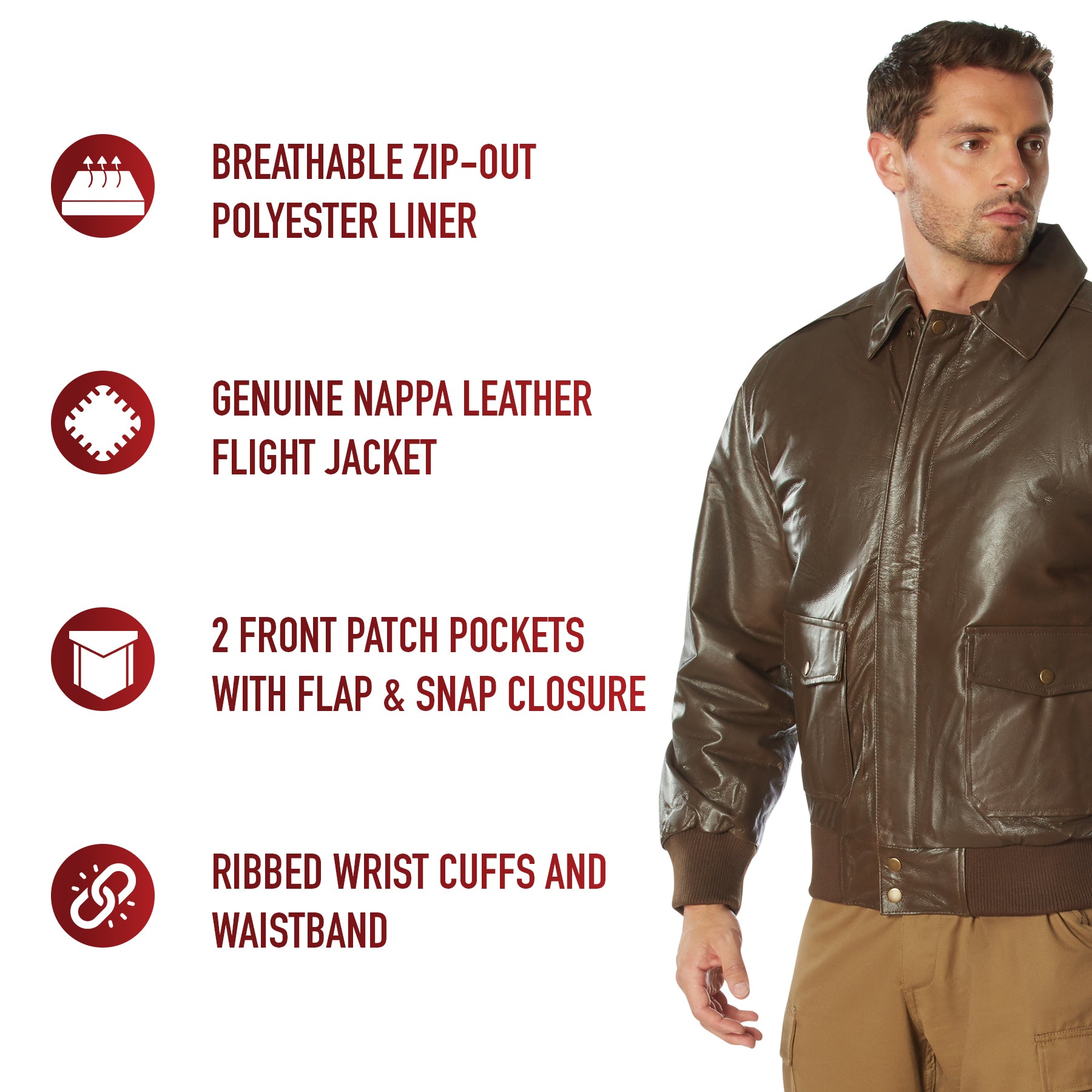 Step into timeless aviation style with Rothco's Classic A-2 Leather Flight Jacket. Crafted from premium genuine Nappa leather, it exudes the vintage look and feel of a pilot's favorite. The jacket features a breathable zip-out polyester liner, ensuring comfort in any weather condition. With 2 front patch pockets adorned with flap and snap closures, along with convenient slash pockets behind them, you'll have ample storage space for your essentials. The fold-down collar, accented with snaps, adds to the jacket's classic aesthetic and allows for customizable styling options. Additionally, ribbed wrist cuffs and waistband ensure a secure and comfortable fit, while adding an extra layer of authenticity to the jacket's design. Whether you're exploring the city or taking to the skies, Rothco's A-2 Leather Flight Jacket is the epitome of timeless style and functionality, perfect for any adventure.