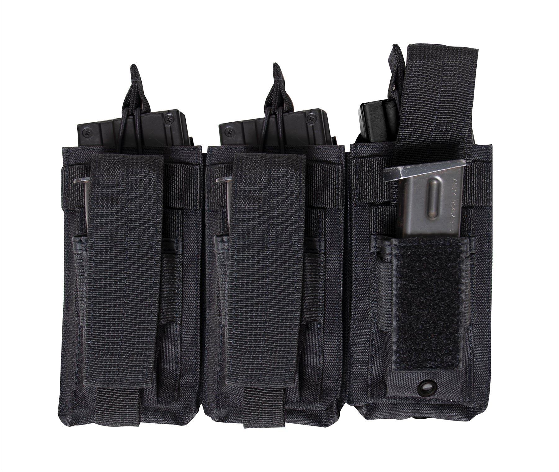 Keep your reloads close at hand at the range with Rothco’s MOLLE Triple Mag Pouch. This multipurpose mag pouch holds a total of six magazines: three pistol and three rifle mags. The pistol mag pouches are secured with hook and loop closures and are compatible with most standard sized pistol mags including .40 Cal and 9mm. The open top rifle mag pouches are secured with elastic cords with pull tabs and are designed to fit most standard sized rifle mags including AK-47 and M-16 mags. This MOLLE compatible mag pouch is great for mounting on tactical vests, assault packs, battle belts, and more. The MOLLE magazine pouch is made from durable materials for years of use and measures 10 inches x 6.75 inches x 2 inches.