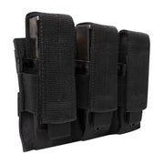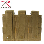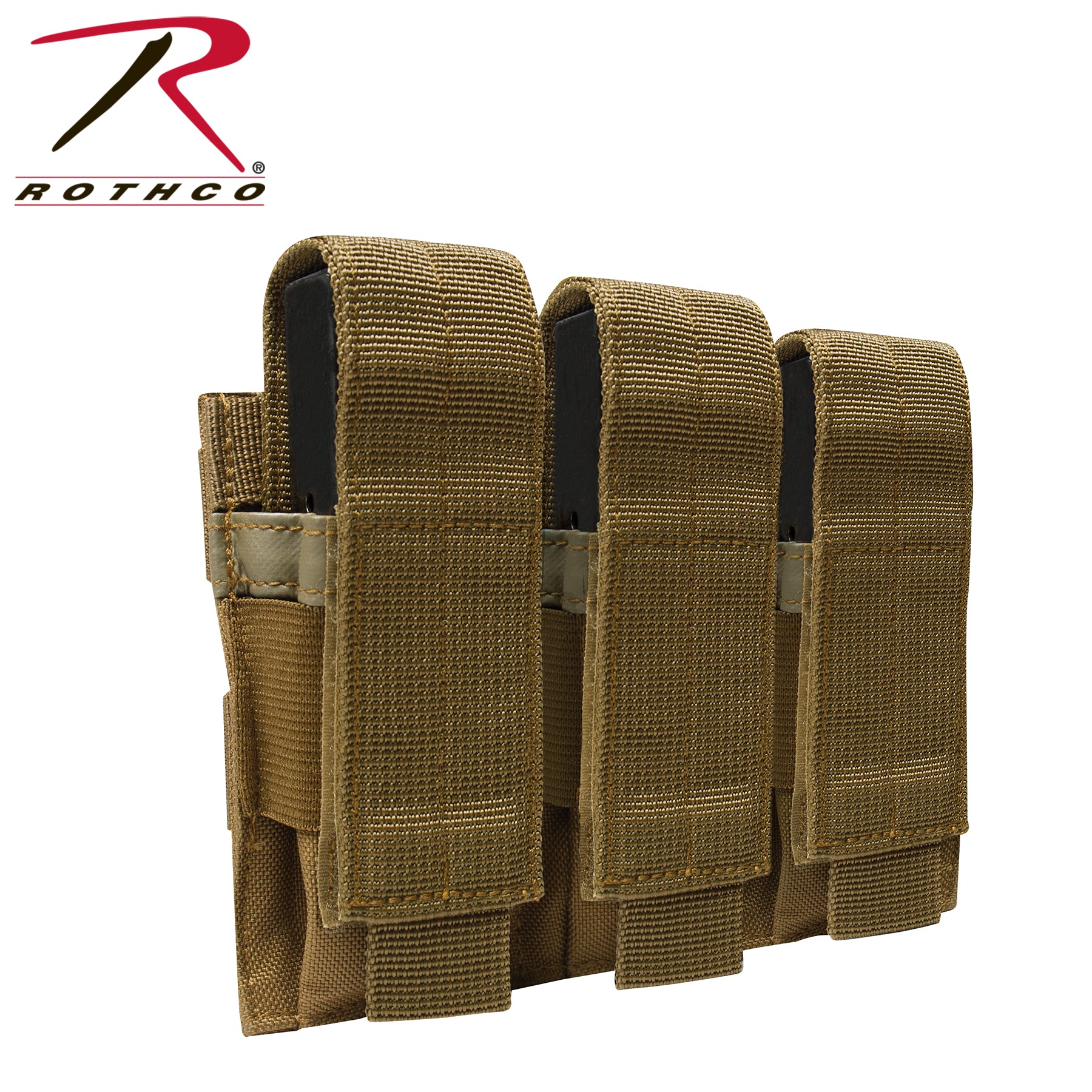 Keep your spare mags close at the range or on the battlefield with Rothco’s MOLLE Triple Pistol Mag Pouch. The MOLLE pouch features three pistol mag holders secured with elastic straps and hook and loop closures. The hook and loop straps can be removed from the mag pouch for quick and easy access to your ammo at the range. The MOLLE compatible plate carrier mag pouch is perfect for mounting on tactical vests, assault packs, and more. This ammo pouch is compatible with most standard-sized pistol mag pouches including 9mm, .40 cal, and more (Measures 6.75 inches x 4.25 inches). The triple mag pouch is made from durable materials for years of reliable use and features grommet drainage holes.