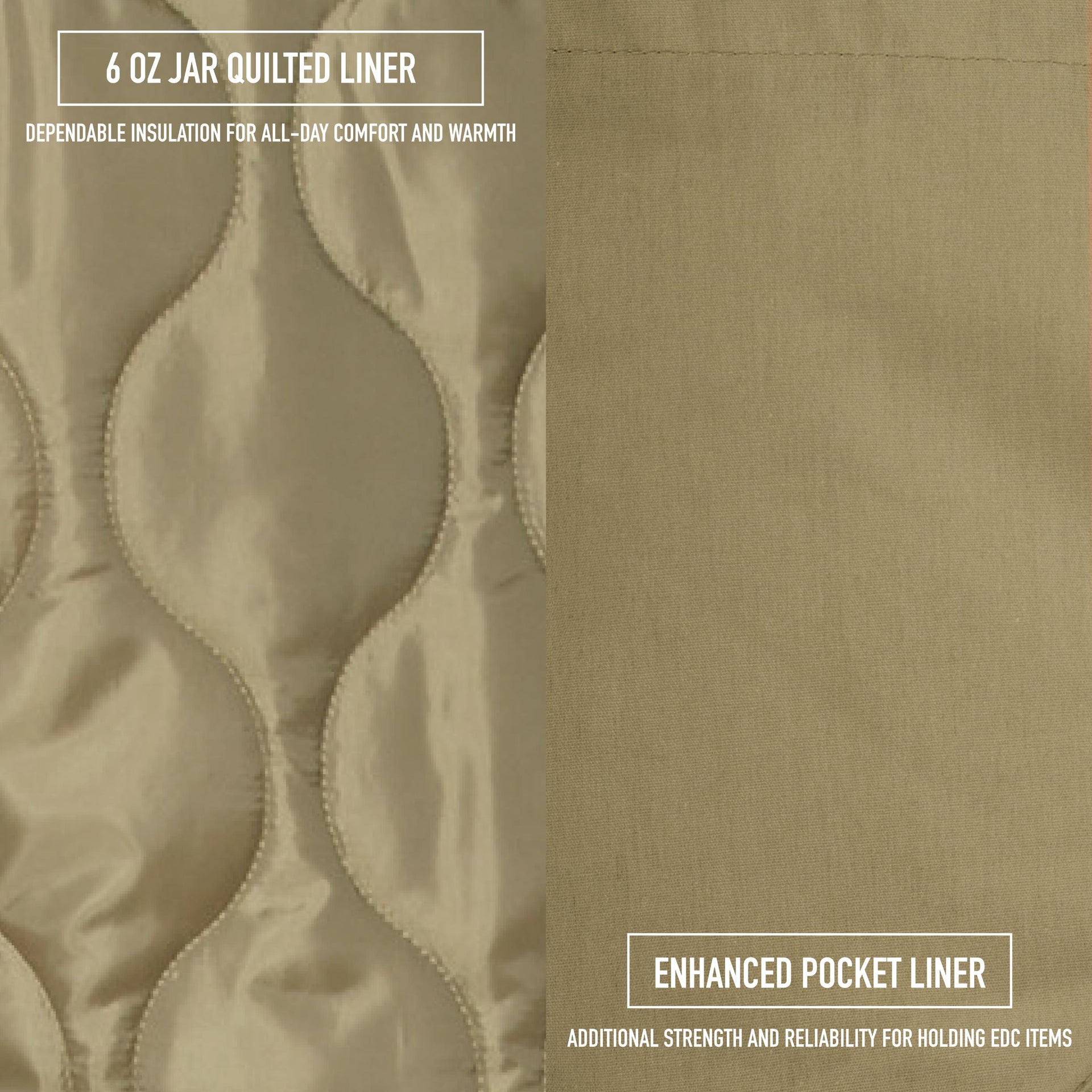 - With 6 OZ jar quilting and an outer shell that’s 100% 190T polyester, our insulated jackets provide all-day comfort and warmth, just like the classic military woobie! The soft ribbed knit fabric collar and cuffs help with heat retention and insulation.