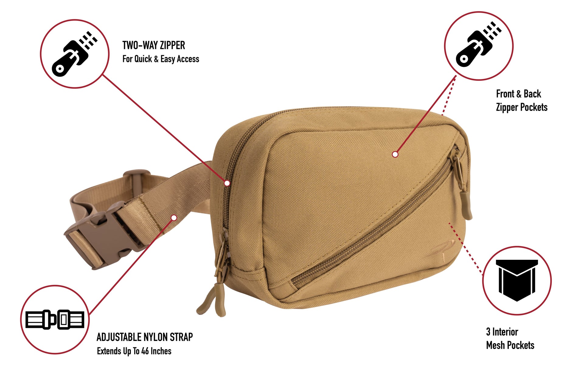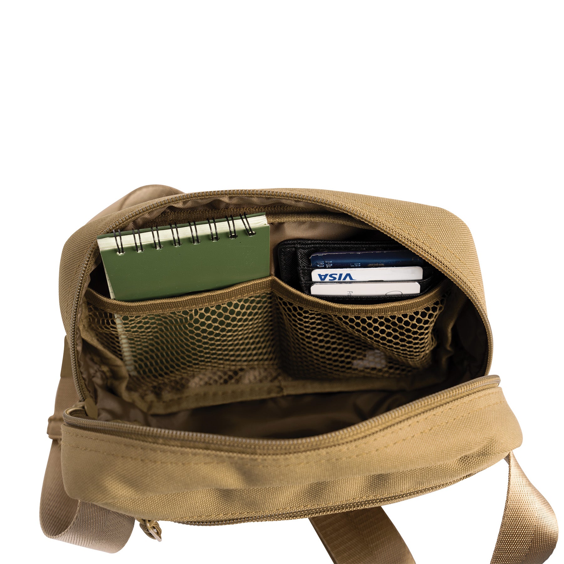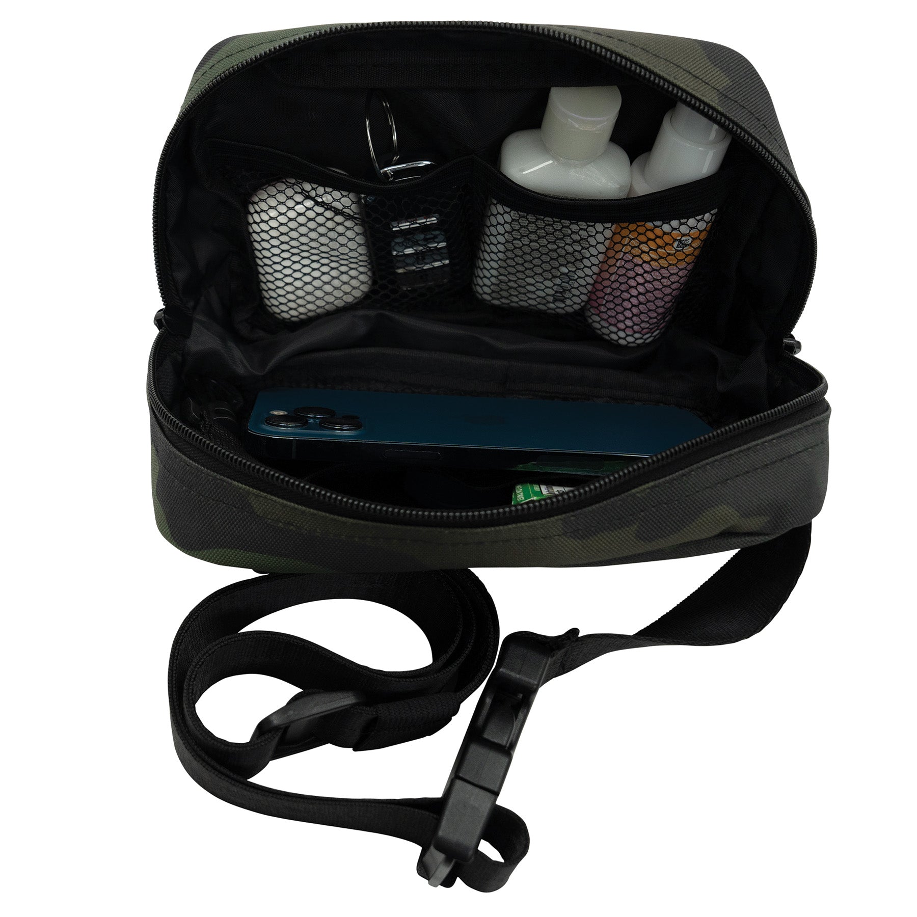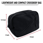 Built with everyday practicality and comfort, our Crossbody Day Bag keeps your possessions close to you, right where you need them. Compact and designed to fit comfortably between your shoulder blades, this crossbody organizer bag has a 2L capacity that is ideal for travel and measures 8 inch x 5.5 inch x 3 inch. On-the-Go Ruggedness: Designed to stay with you every step of the way, the travel bag is made with a robust 1000D nylon construction that easily withstands any environment. This belt bag is a must-have for traveling, commuting, concert-going, adventuring, and more. Stay Organized: The crossbody bag offers substantial storage space inside the main compartment for EDC essentials, such as a phone and wallet. The 3 mesh pockets are perfect for carrying small items, while the internal clip is great for securing keys or accessories. Safe & Secure Zipper Closures: The main compartment utilizes a two-way zipper that opens at both ends for quick and easy access. In addition, the lightweight organizer bag features 2 exterior zipper pockets on the front and back for paperwork, cash, earbuds, chargers, and more. Various Carry Options: This versatile belt bag uses an adjustable nylon strap with a side release buckle that extends up to 46 inches, allowing you to wear it across your body as crossbody bag or around your waist as a fanny pack.