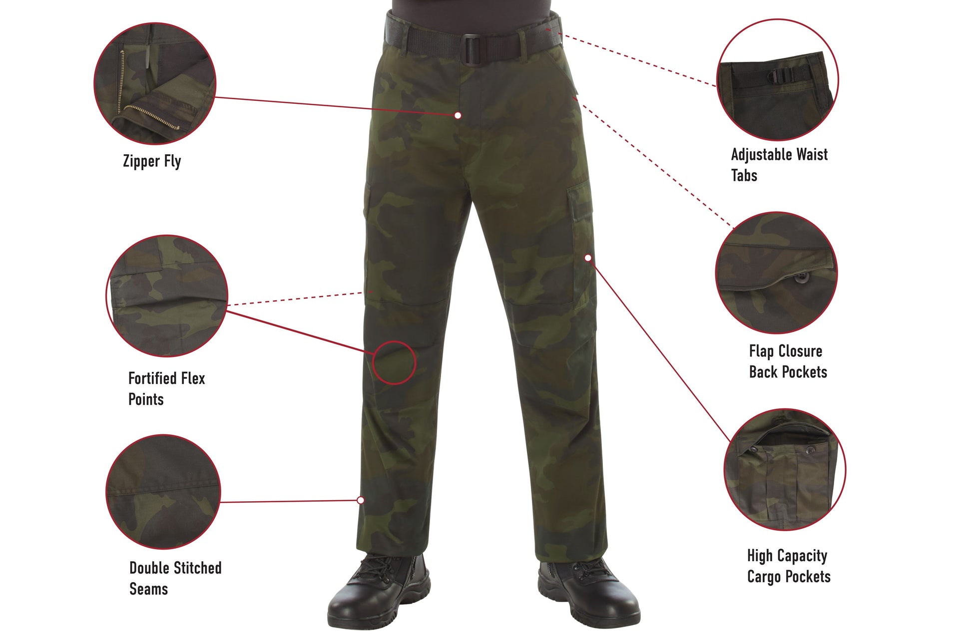 Constructed from a rugged 55% cotton / 45% polyester blend, our Midnight Camo Tactical BDU Pants are built for unparalleled performance, comfort, and convenience. These BDUs are not afraid to get down and dirty, and are perfect for various outdoor activities, such as camping, hiking, hunting, fishing, and more. Ultimate Stealth Ops Camo: Inspired by stealth operations that require zero visibility to the opposition, Rothco has reinvented the classic Woodland Camouflage Pattern as well as our bestselling Black Camouflage Pattern to bring you the Midnight Camo Collection. The subdued color combinations offer a true stealth, sharp and sleek appearance whether on mission or off. Tried-and-True Reliability: These tactical camo pants are reinforced in the seat and knees for maximum durability that endures wear and tear while supporting a full range of motion. The double-stitched seams provide extra strength and years of reliable use. High-Capacity Cargo Pockets: The camo cargo pants provide functional utility through 2 front slash pockets, 2 large button-down cargo pockets, and 2 button-down back pockets for storing everyday essentials like your phone, wallet, keys, or multi-tool. Utility at the Forefront: These tactical camouflage pants feature a zipper fly. The adjustable waist tabs enable you to find the perfect fit. In addition, the straight leg opening fits over boots comfortably while the drawstring ankle ties allow you to easily adjust the fit.